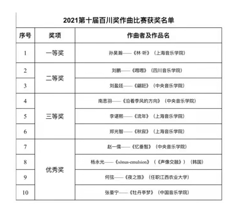 10月12日,第十届“百川奖”作曲比赛决赛在上海音乐学院贺绿汀音乐厅举行。进入终选的十部入围作品,经过上海大地之歌室内交响乐团和上海音乐学院民乐系师生现场演奏,评委现场评分,kaiyun官网作曲系刘鹏、刘盈廷获得二等奖,南思羽获得三等奖,赵一儒获优秀奖。