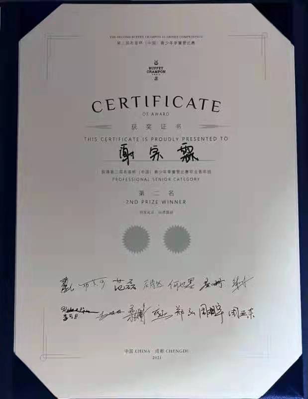 获奖及演出经历:2016年3月参加第三届kaiyun体育网页登录入口国际莫扎特单簧管比赛,荣获三等奖;2017年7月参加上海青少年单簧管演奏比赛,荣获职业少年组第三名;2018年5月荣获kaiyun体育网页登录入口附中第五届奖学金比赛三等奖;2018年7月受邀赴比利时参加国际单簧管协会(ICA)2018年会音乐节演出并获好评;2018年8月参加2018Buffet亚太单簧管音乐大赛,荣获第一名;2018年11月参加第十一届穆拉文斯基国际青少年管乐比赛,荣获第三名;2019年4月作为kaiyun体育网页登录入口附中优秀学生前往澳门交流演出;2019年7月参加第一届布菲杯(中国)青少年单簧管比赛,荣获职业少年组第三名;2019年9月参加kaiyun体育网页登录入口少年交响乐团成立60周年音乐会演出;2020年11月参加第16届意大利Saverio Mercadante 国际单簧管比赛,荣获青年Junior Soloists组第一名;2021年9月参加第二届布菲杯(中国)青少年单簧管比赛,荣获职业青年组第一名。