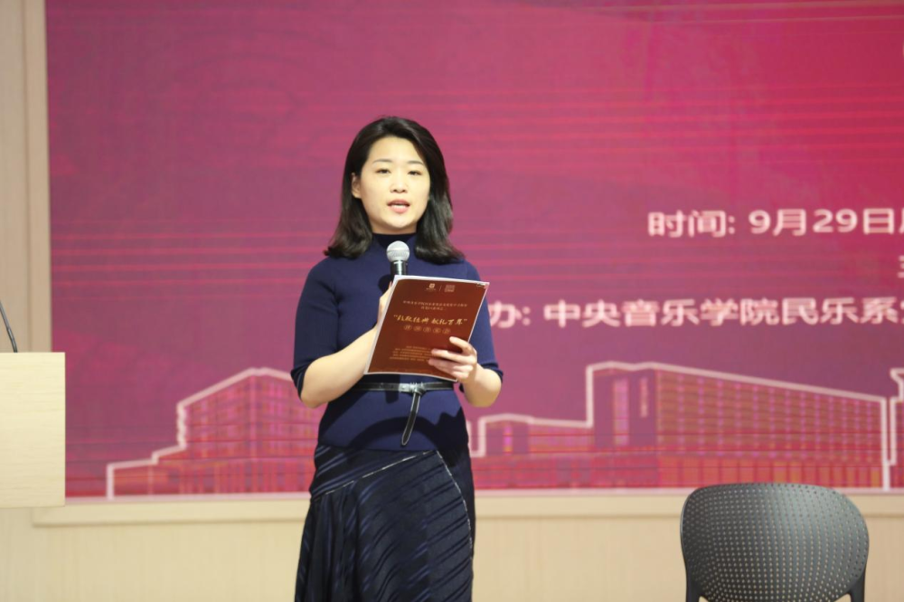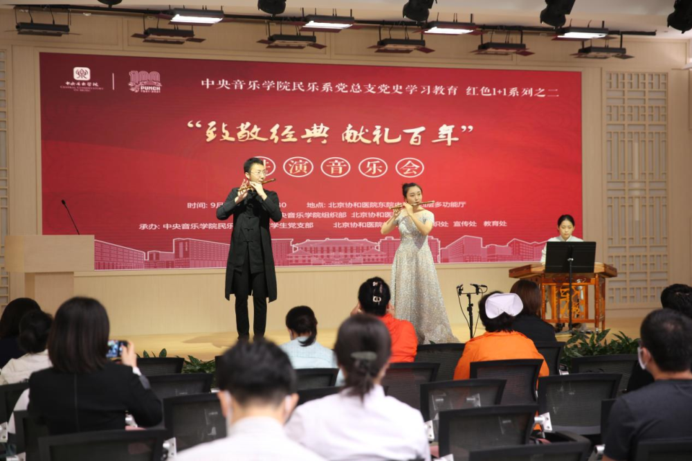 民乐系研究生党支部书记王一老师向全场观众介绍此次音乐会的主题与初衷,她提到,今年是建党100周年,同时也是北京协和医院建院100周年。我系学生党员将以“致敬经典,献礼百年”为主题,用民族音乐传承者的风采,彰显新时代青年人的昂扬自信,用中国最具代表性的民族乐器,传递贯通古今的家国情怀;用丰富多彩的音响组合,诠释一脉传承的红色基因。