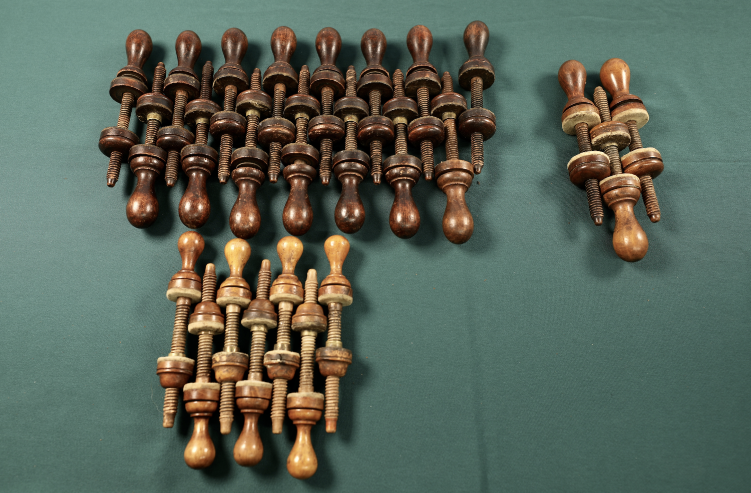 7、英国硬木材质小提琴(含儿童琴)、中提琴及大提琴合琴夹具。夹具木杆上配有螺纹。1900-1930年间出品。它使用在琴板与侧板间,是在粘合侧板与琴板时的固定工具。