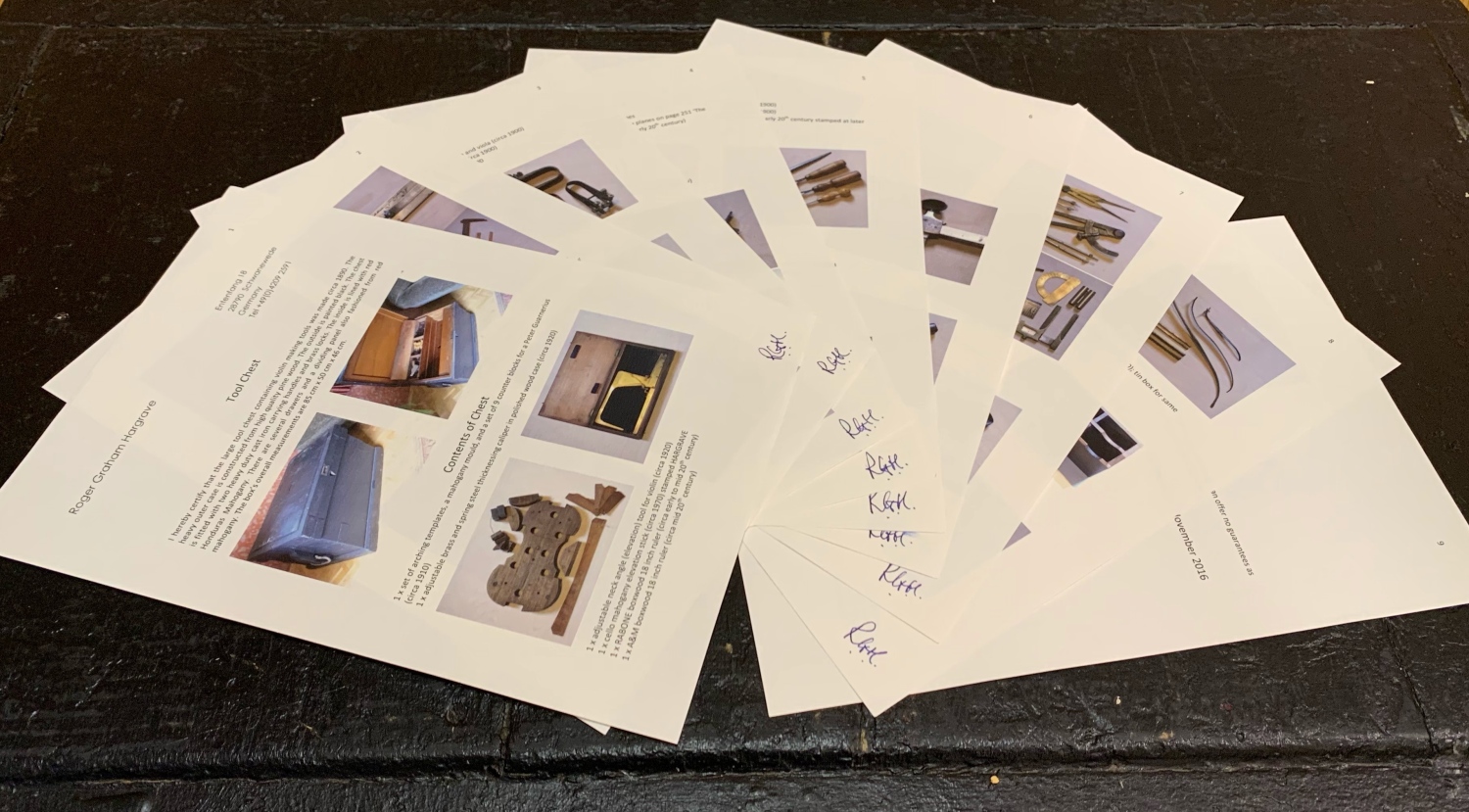 Roger Hargrave签名的百年制琴工具鉴定证书