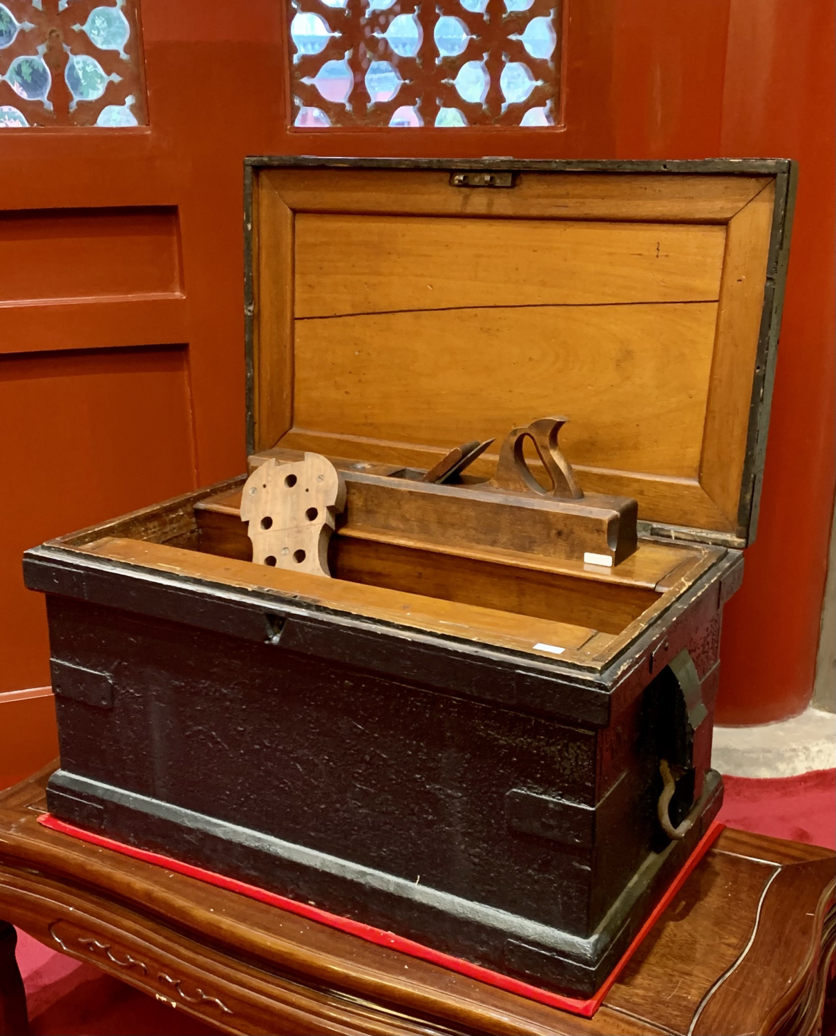 1、所有工具储纳于约制于1890年的松木箱中。箱体外壳厚实,外表涂有黑漆,两侧装有两个重型铸铁提手,箱子配有黄铜暗锁,内部全部选用洪都拉斯桃花心木,为三层抽屉加隔板翻盖结构。做工精细,设计巧妙,刚好储纳制琴工具。