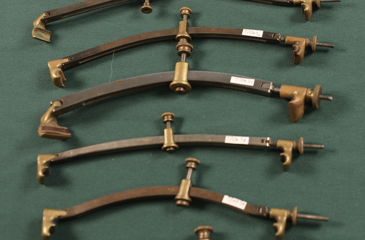 5、约1900年手工制作的带有琴板弧度形状的琴板裂缝修复夹。采用双层钢片结构,万向型铸铜挂钩并配有螺丝微调。双层钢片设计避免了在使用中修复夹与琴板弧度间所产生的位移,设计独特、先进、科学。