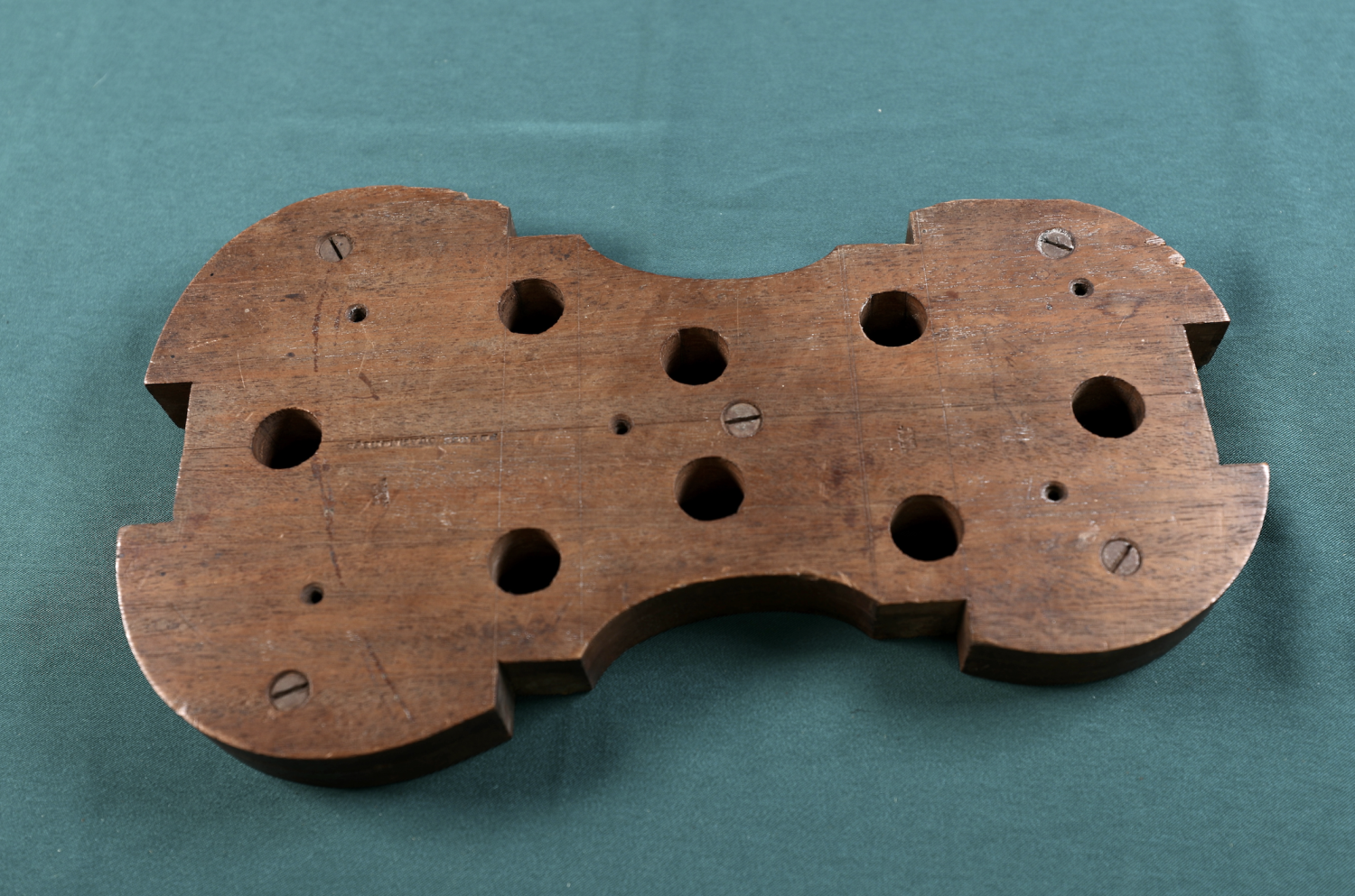 2、Pietro Guarneri 琴型内模具,约1910年制作。第一张图片琴模厚度接近琴箱侧板高度,薄厚双层设计,使用时在侧框粘合结束后,取下薄层随后进行衬条的安装。这种模具厚度设计有别于Stradivari,意在最大限度地控制侧框最终结束时的准确度,还配备侧板角木及端木的所有垫木(第二张图片)。第三张图片为琴板长弧度和横弧度样板尺。