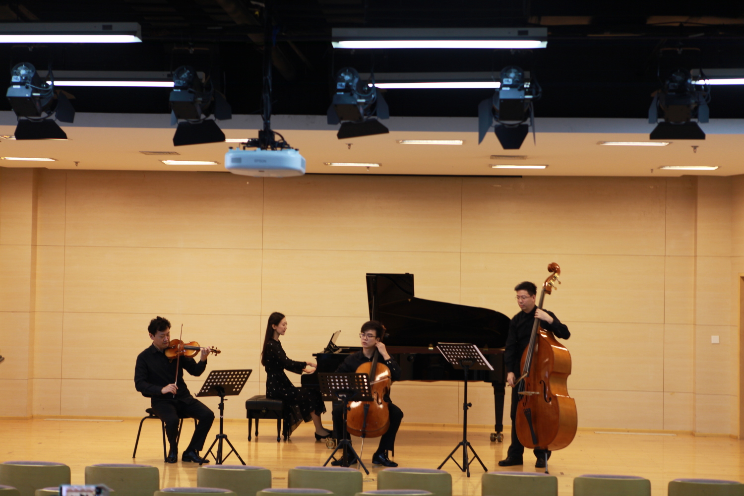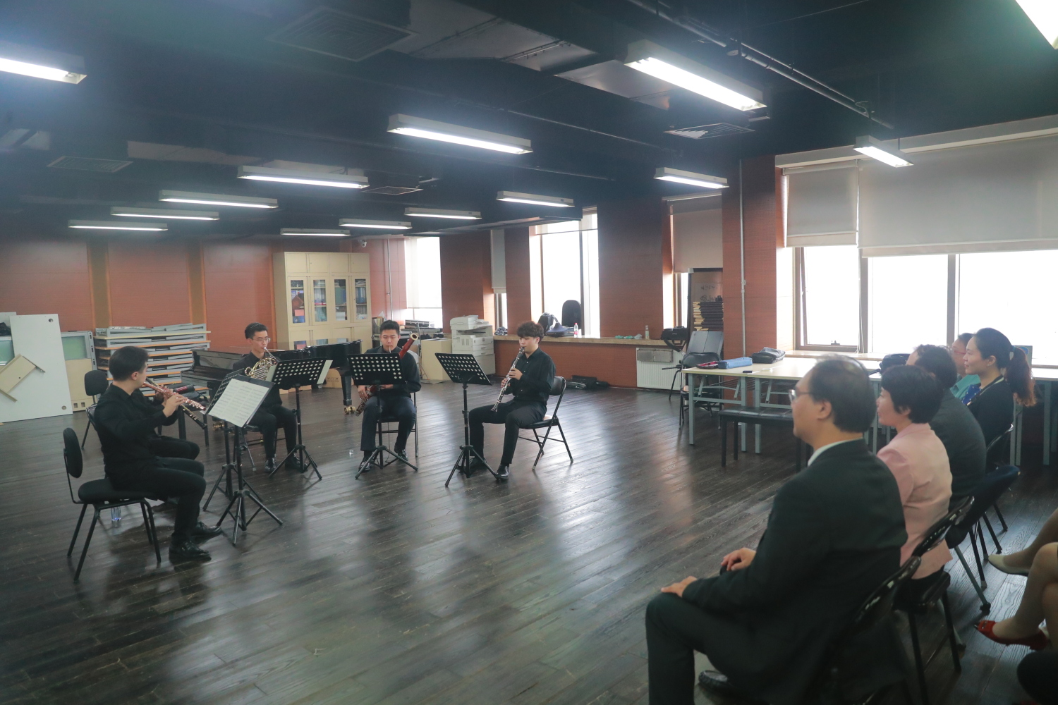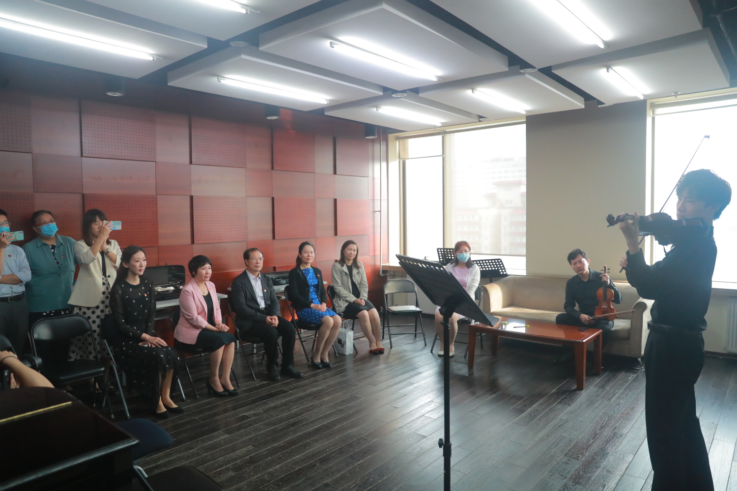 观摩结束后,全体党员来到教学楼701进行党史学习教育成果展示。由教育部国际司(港澳台办)的青年干部带来的诗朗诵《不忘初心》,用声情并茂地诵读追溯建党百年的峥嵘岁月,歌颂中国共产党100年来的砥砺奋进和辉煌成就,抒写不忘初心、追梦前行的壮志豪情。由管弦系党总支书记陈光、教师党支部书记尹一迦、管弦系教师陈曦、陳翰叡联合学生带来的乐器合奏节目:钢琴四重奏《我爱你中国》和铜管五重奏《我的祖国》,用音乐表达对党与国家的深情和热爱。通过诗歌和音乐,在重温红色经典的同时歌颂党的光辉岁月与风雨历程,抒发对党的诚挚祝福和深厚情感。