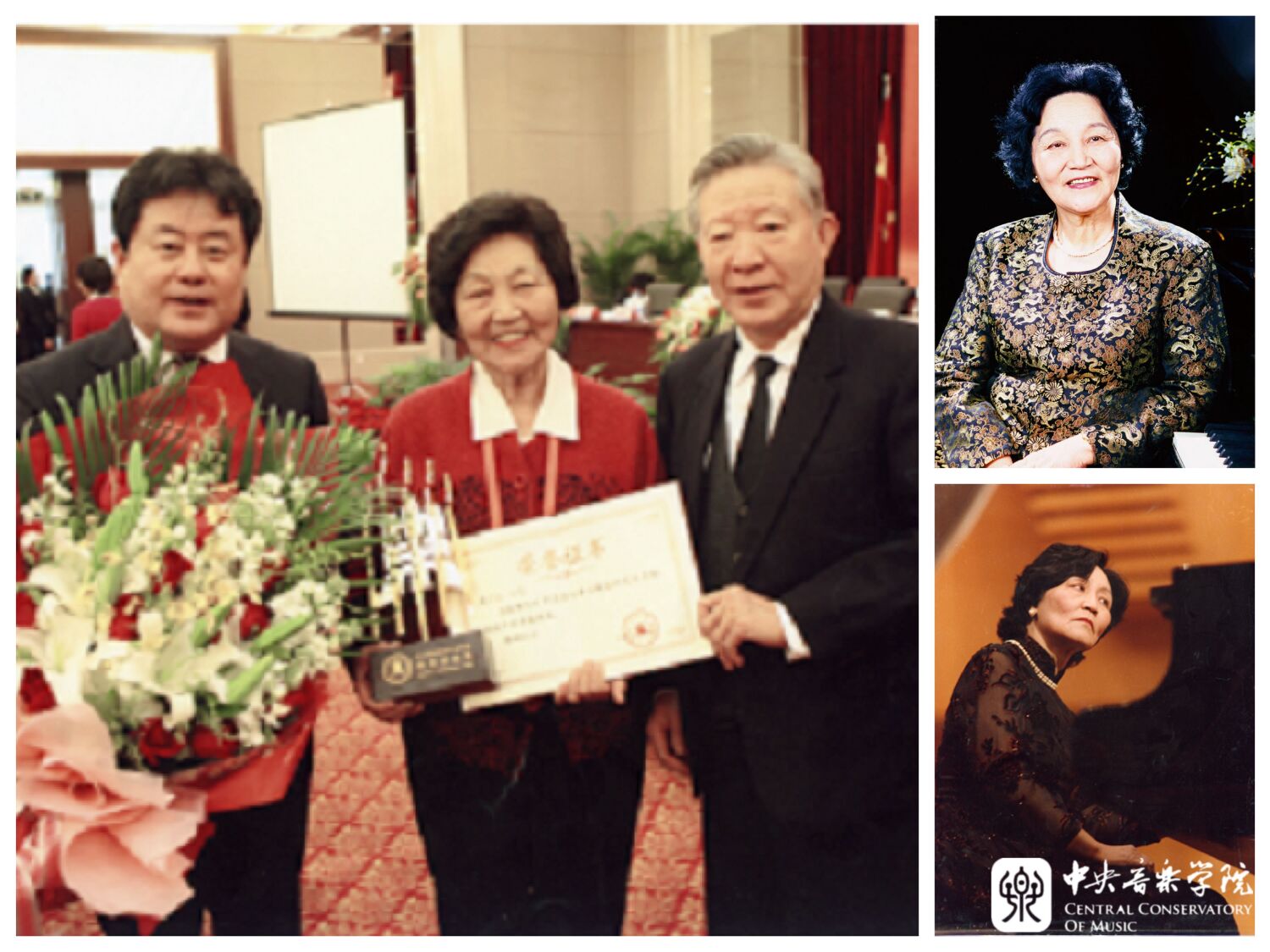 上,20世纪90年代初,周广仁与法国钢琴家沃苏拉·赛乐及钢琴系师生合影。