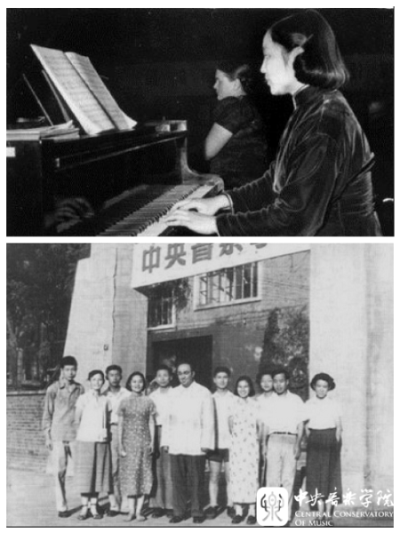 上,20世纪50年代,周广仁与来校讲学的苏联钢琴家克拉芙琴科表演双钢琴。
