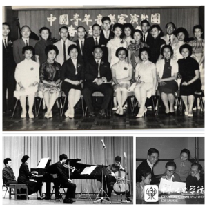 下,1951年,赴捷克斯洛伐克参加“布拉格之春”音乐节,座位中间者为周广仁,其右为喻宜萱。