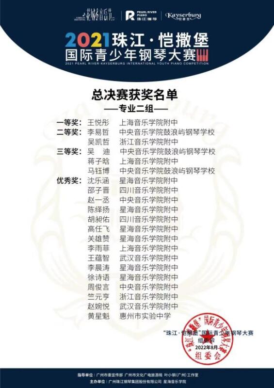 “珠江·恺撒堡”国际青少年钢琴大赛是是国内规格最高、评委阵容最强、规模最大的钢琴赛事之一。本届赛事自2021年4月启动以来共吸引超10万人参赛,并覆盖全国32个赛区和海外14个赛区。它是1983年“珠江杯”全国青少年钢琴邀请赛的延续和升级。大赛每两年举办一届,历届诸多获奖选手已成为中国钢琴界的领军人物和中坚力量。