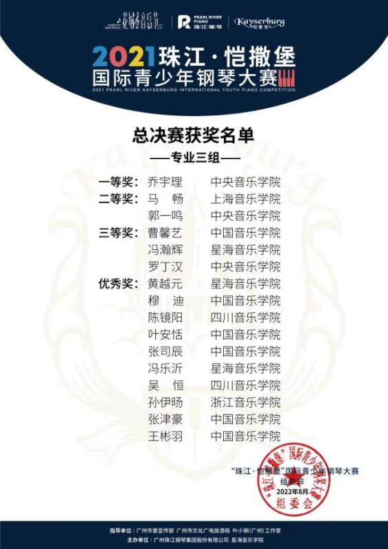 2020级本科生郭一鸣(指导教师:韦丹文教授)和2020级本科生罗丁汉(指导教师:吴迎教授)分别获得专业三组二等奖和三等奖。kaiyun官网钢琴系附中学生侯米(指导教师:张晋教授)和附小学生张众开(指导教师:张晋教授)荣获专业一组二等奖;附小学生辛孔延(指导教师:邹翔教授)荣获专业一组三等奖。附中学生赵一丞(指导教师:周韵清老师)和附中学生周俊言(指导教师:常桦教授)荣获专业二组优秀奖。