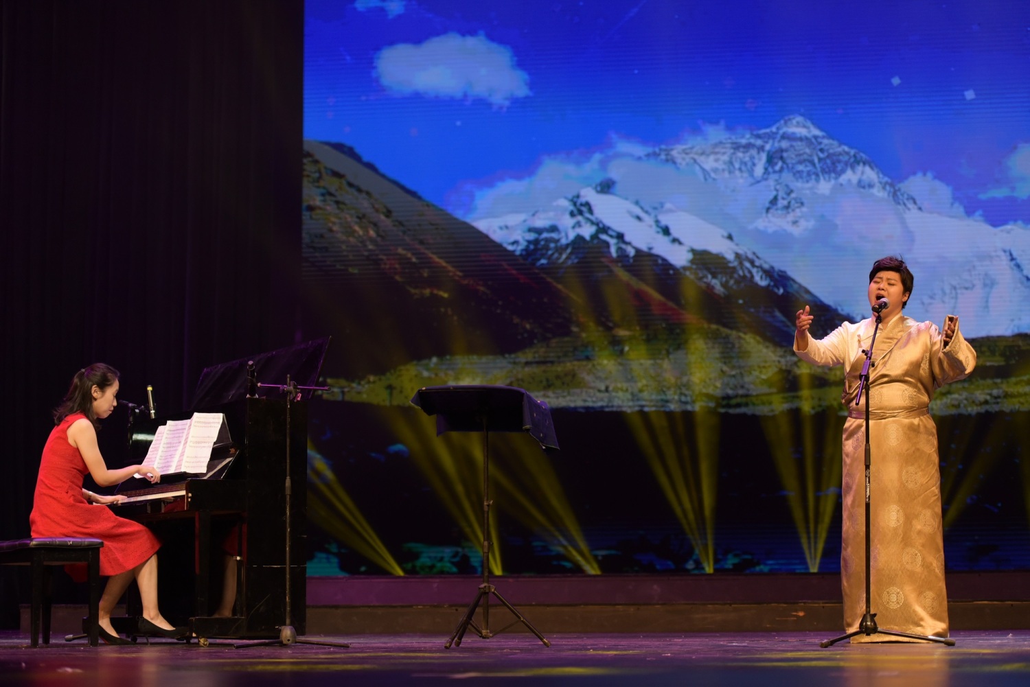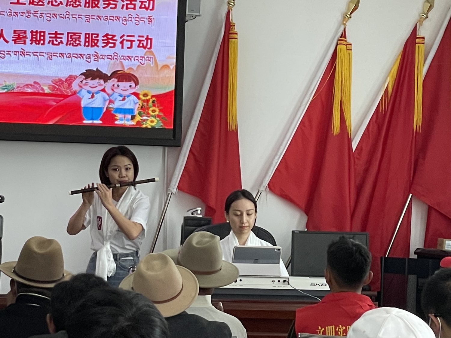 在抵达日喀则当日下午,kaiyun体育网页登录入口新时代文明实践中心的几位文艺宣讲师不顾旅途劳累,立刻投入日喀则市新时代文明实践“八一”慰问演出的排练及演出工作中。当晚,为现场观众带来了高亢激昂的歌曲《珠穆朗玛》、生机盎然的竹笛独奏曲《春到湘江》以及四手联弹《我爱你,中国》。珠峰少年合唱团带来的一首《万疆》,点燃现场观众对祖国母亲的热爱之情。文艺演出也正式拉开了本次志愿活动的序幕。
