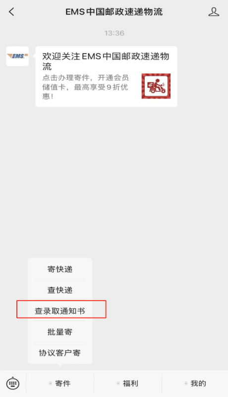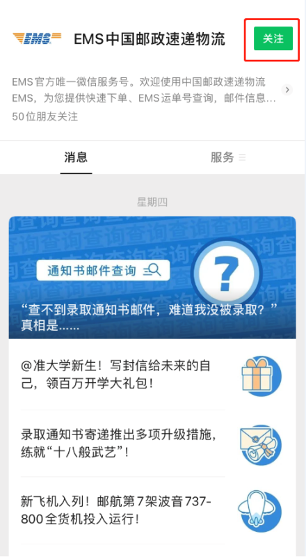 2022年kaiyun体育网页登录入口本科录取通知书已于7月20日全部发出(不含上海籍考生、香港中学文凭考生),考生请注意查收中国邮政EMS手机短信提醒的邮件单号,也可通过本人用户名、密码登录kaiyun官网本科招生系统(澳门保送生、新疆单列类考生、上海籍考生、香港中学文凭考生除外)zhaoban.ccom.edu.cn,查询自己的邮件单号,凭邮件单号登陆EMS公众号查询邮件投递情况及在途状态。 使用EMS公众号查询方法: