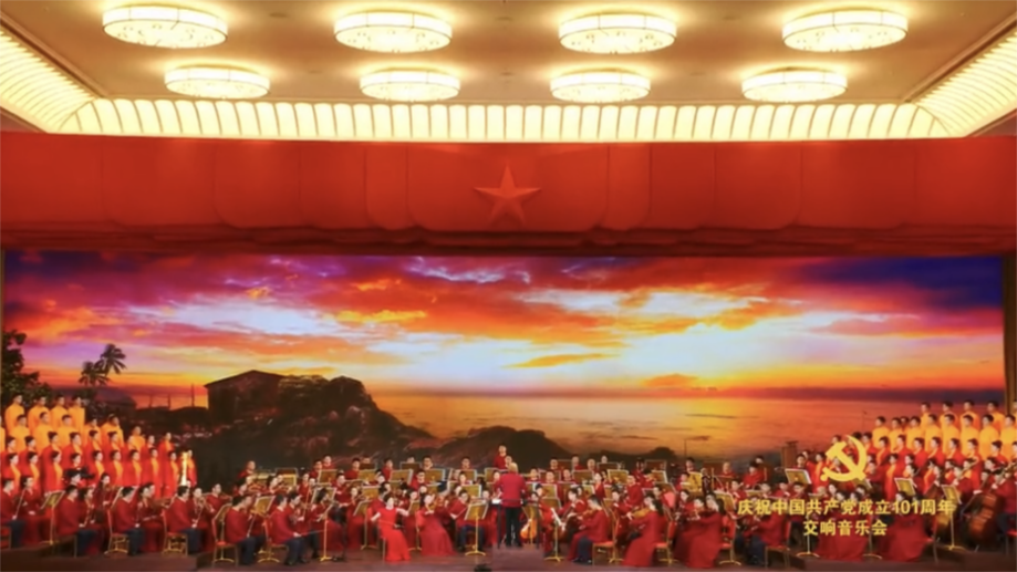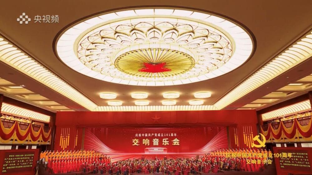 7月1日当晚,中国共产党历史展览馆红色大厅灯火通明,用红旗元素搭建、黄色绶带装饰的舞台与帷幔一起烘托出庆典氛围,大厅顶部中央镶嵌的五角星熠熠生辉。音乐会共分为四个篇章,一首首经典曲目和新创作品,带领全场观众追寻红色记忆、感悟红色精神、汲取红色力量,奏响实现中华民族伟大复兴的天地交响。