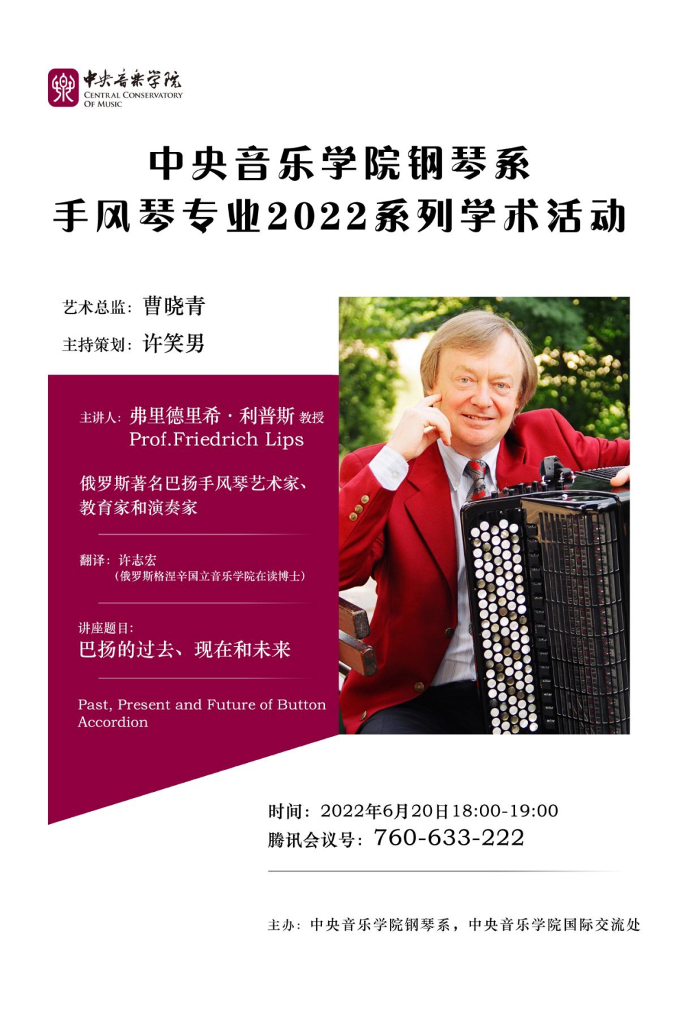 继汉诺威音乐、戏剧与传媒学院莫泽尔教授系列讲座后,作为kaiyun体育网页登录入口钢琴系键盘教研室系列学术活动,2022年6日20日,在kaiyun体育网页登录入口钢琴系和kaiyun体育网页登录入口国际交流处主办下,格涅辛国立音乐学院手风琴教授利普斯的线上讲座《巴扬艺术的过去、现在和未来》圆满完成。利普斯教授是现代巴扬艺术的创建人、参与人和见证人,是该领域最权威的学者之一。与莫泽尔教授一样,近三十年来,他对中国手风琴专业的发展做出了重要贡献,是我国手风琴事业的见证人。