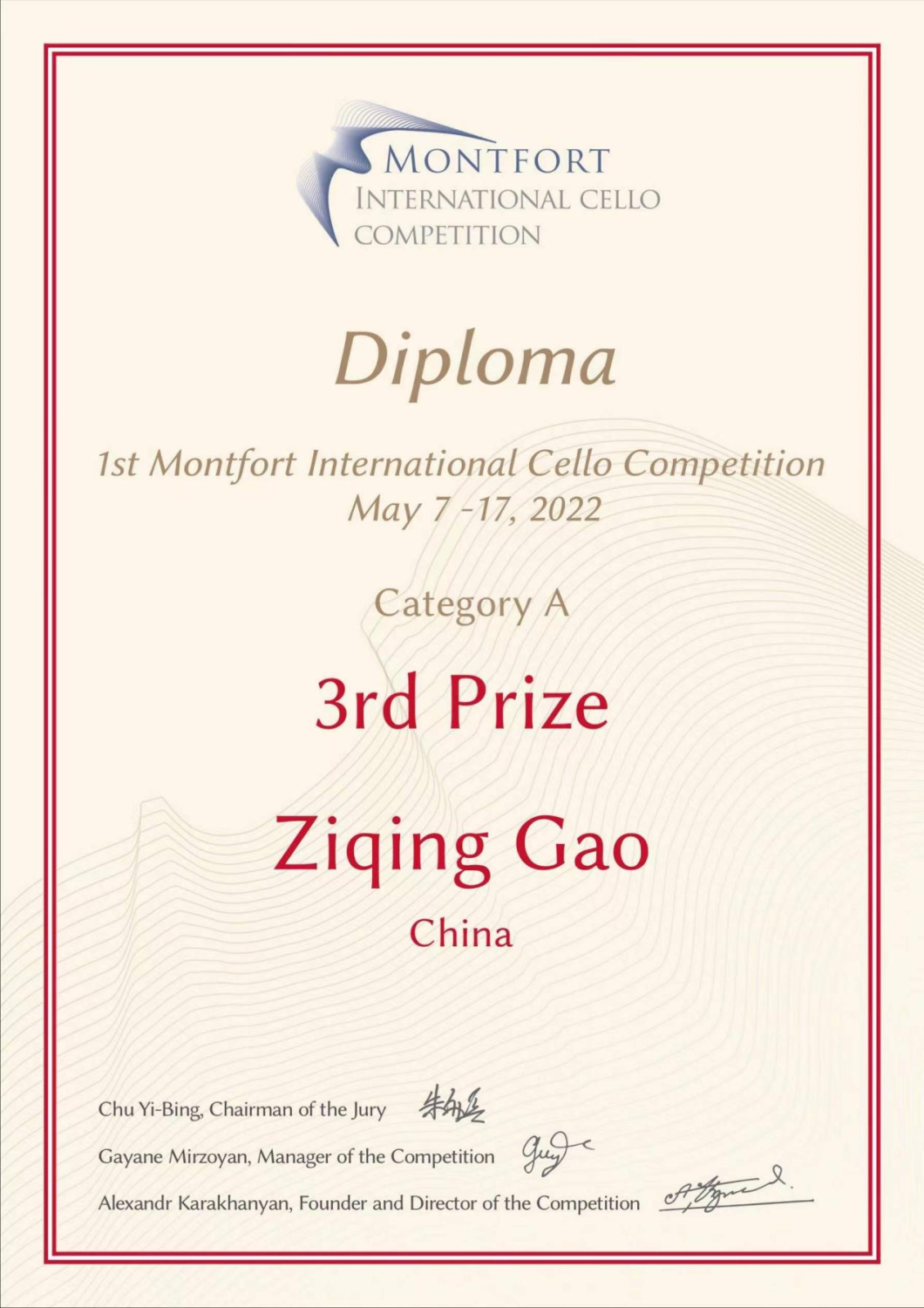 2022年奥地利蒙特福特国际大提琴比赛Category A组三等奖。