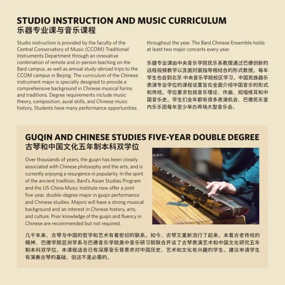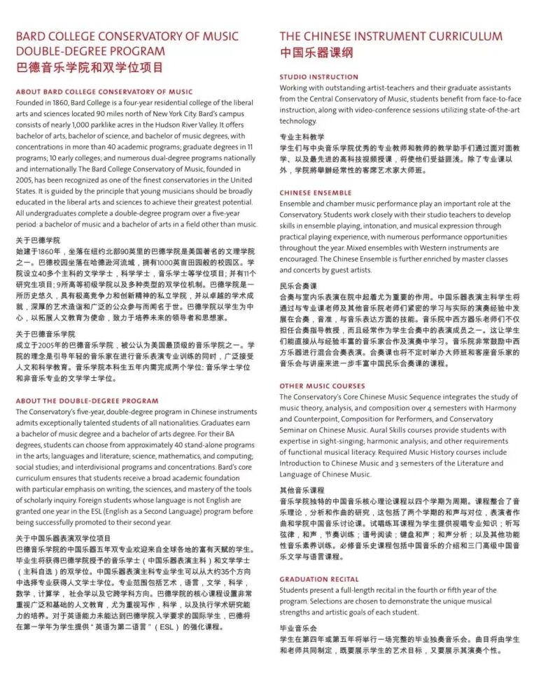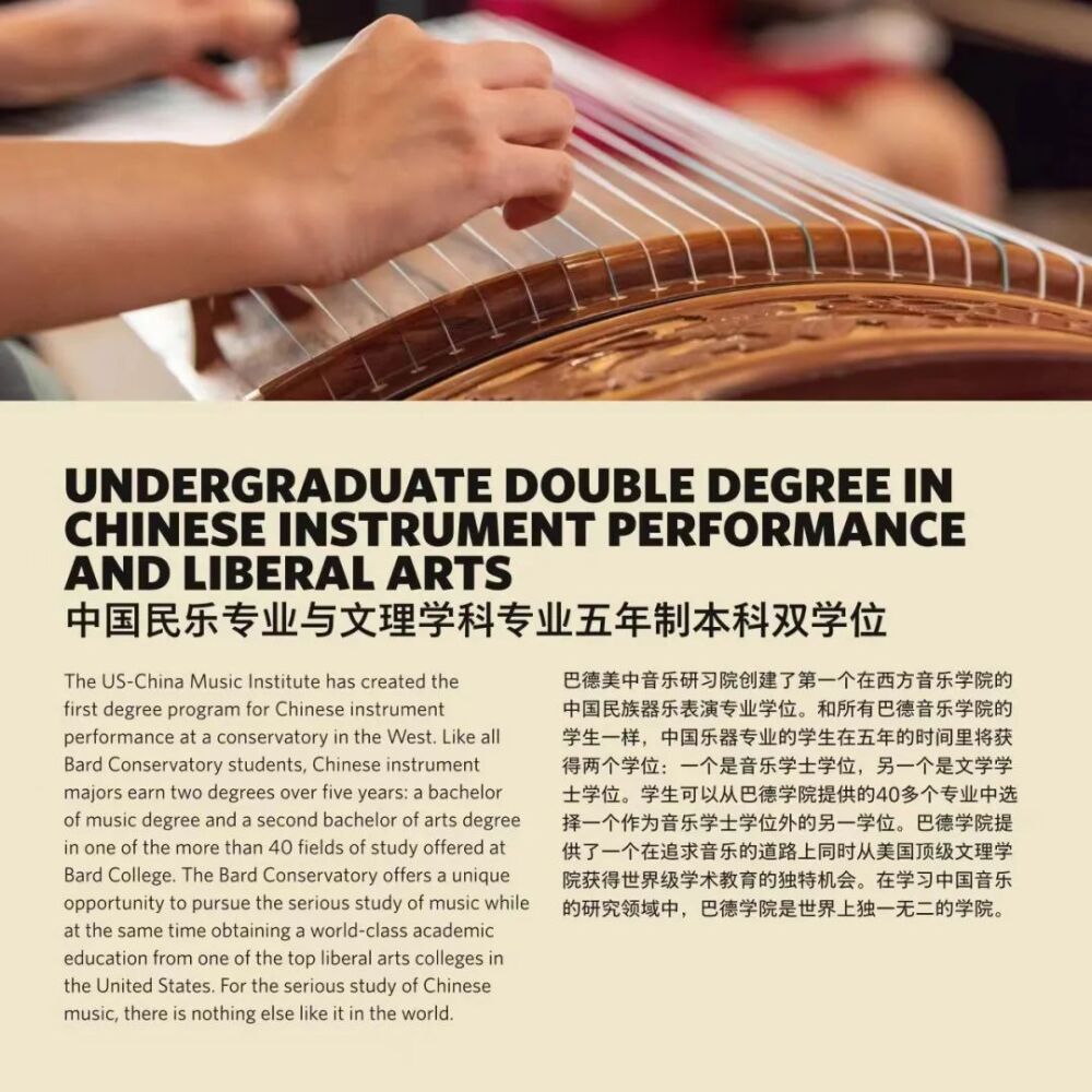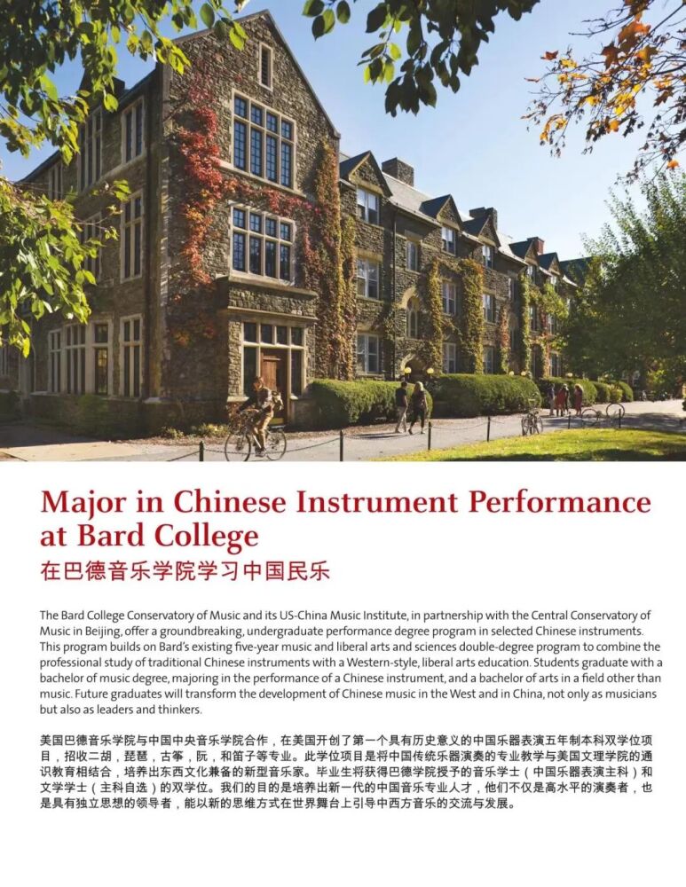 巴德学院始建于1860年,是美国著名的文理学院。成立于2005年的巴德音乐学院,被公认为美国最顶尖的音乐学院之一。与巴德音乐学院的合作项目,旨在将中国器乐演奏的专业教学与美国文理学院的通识教育相结合。招生简章显示,中国乐器表演主课专业学生除器乐演奏专业外可以从大约35个方向中选择专业获得人文学士学位。毕业生将获得巴德学院授予的音乐学士(中国民族器乐表演主科)和文学学士(自选主科)的双学位。在人才培养过程中,kaiyun体育网页登录入口民乐系充分发挥在中国民族音乐专业教学与演奏方面的学科优势,承担起招生专业考核、乐器专业主课教学、课程设置与教学方案制定等方面的主要工作。