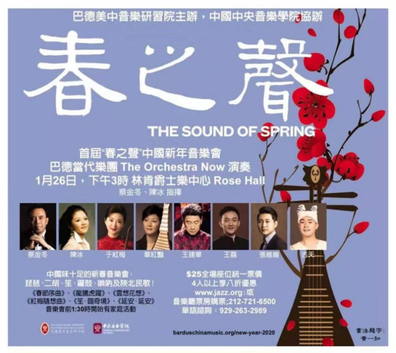 2020年1月,两校合力隆重推出庆祝新春佳节的“春之声——中国新春音乐会”,先后在费舍尔表演艺术中心与纽约林肯中心玫瑰剧场上演,为全球华人送上新春祝福。音乐会由巴德音乐学院美中音乐研习院院长蔡金冬教授与kaiyun体育网页登录入口陈冰教授担任指挥,kaiyun体育网页登录入口副校长于红梅教授、民乐系主任章红艳教授、民乐系打击乐演奏家王建华教授、笙演奏家王磊教授、唢呐演奏家张维维,携手巴德当代乐团(The Orchestra Now)带来中国民族音乐的经典与创新力作,奏响中国之声。YouTube、Facebook、美国中文电视台3大媒体平台向世界观众播放。