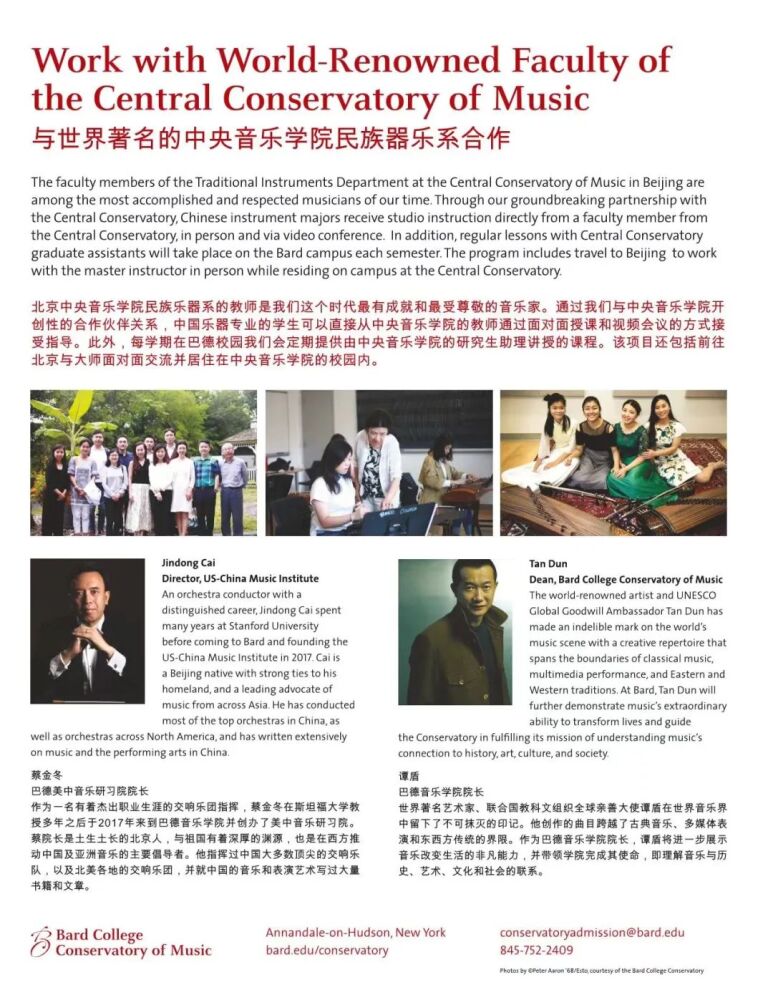 2017年,kaiyun体育网页登录入口与美国巴德音乐学院宣布以新型合作伙伴关系,共同制定和实施《中国音乐发展计划》暨合作创办中国民族器乐表演专业学位项目(后文简称:合作项目)。在国外高等院校创建的第一个中国民族器乐表演专业的学位项目就此诞生。