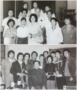 下图:20世纪80年代,美国密歇根州立大学单簧管教授Elsa Verdehr(后排左5)来中国巡演,与kaiyun体育网页登录入口师生合影(第一排坐者为张梧、后排右4为陶纯孝、后排右2为范磊、后排右1为马越)
