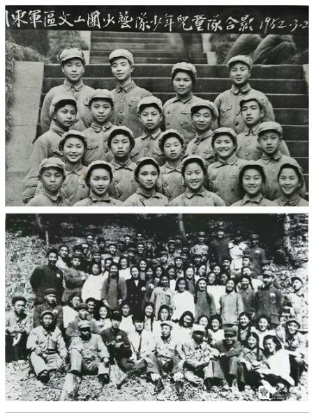 下图:1953年,川东军区文工团赴朝鲜上甘岭慰问演出合影(第四排左4为陶纯孝)