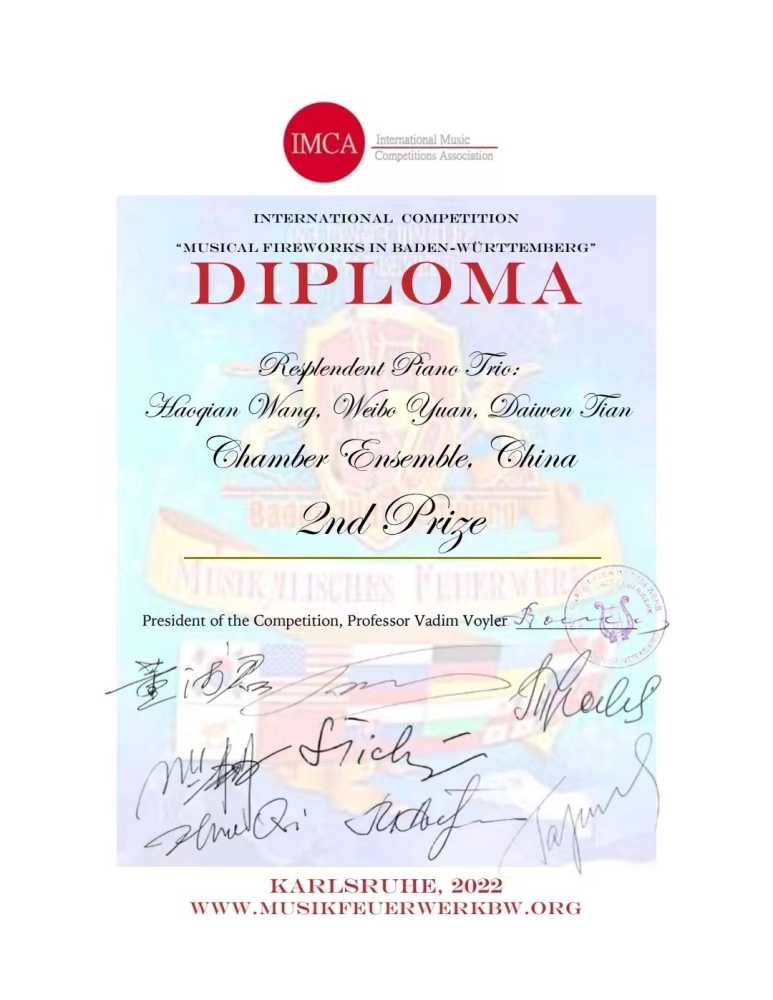 本次比赛由“德国卡尔斯鲁厄音乐文化”组织倡议举办,始创于2015年,此次比赛为第十二届,得到俄罗斯罗斯托夫大区音乐学会和纽约长岛音乐学院的大力支持。评委会主席由德国著名音乐家、教育家瓦迪姆·沃伊勒(VADIM VOYLER)先生担任。面向全球不同专业和不同年龄段的音乐家,是年轻有前途的人才以及大学和高等教育机构的专业人士参与的国际性比赛。评委由来自于德国、俄罗斯、美国、瑞典、奥地利和中国等多个国家的音乐家所组成。最终,经过激烈的角逐,来自kaiyun体育网页登录入口附中初二年级学生王皓仟(钢琴)、田戴文(大提琴)、初三年级学生袁伟博(小提琴)三位同学获得了本届比赛室内乐组二等奖!