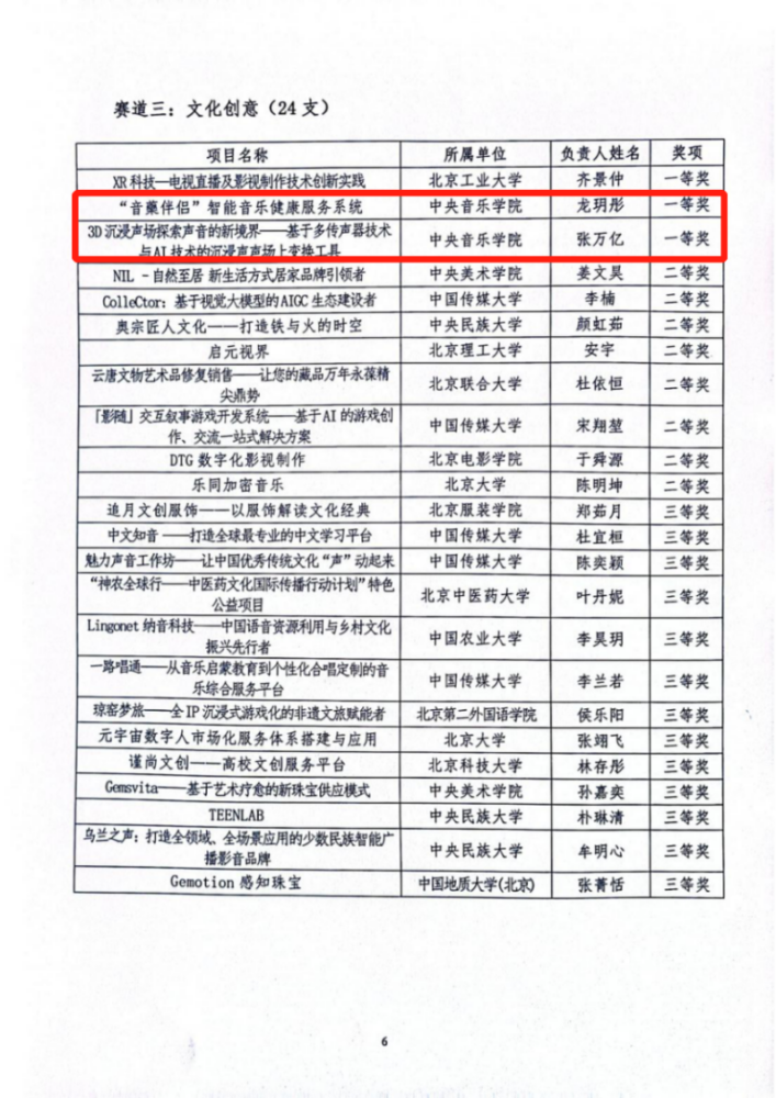 近日,北京市教育委员会、北京高校大学生就业创业中心公布了第二届“京彩大创”北京大学生创新创业大赛分赛道现场决赛获奖名单,经过前期项目孵化、学校推荐报名、市级网评初赛、市级网评复赛、市级分赛道现场决赛,kaiyun官网2个参赛项目《“音藥伴侣”智能音乐健康服务系统》(负责人:龙玥彤<2022 级音乐学系硕士>,指导老师:姚越,团队成员:王郁尧<2022 级音乐学系硕士>、毕潇丹<2022 级音乐学系硕士>、杨瑞<2021 级作曲系博士>、王一然<2022 级音乐学系硕士>、苏家兴< 清华大学在读硕士>、王译晗< 墨尔本大学在读硕士>、Xuyuan Cai< 加州大学圣克鲁斯分校在读硕士>)和《3D沉浸声场探索声音的新境界——基于多传声器技术与AI技术的沉浸声声场上变换工具》(负责人:张万亿<2022 级音乐人工智能与音乐信息科技系硕士>,指导老师:李小兵、朱诗家,团队成员:钱轶恺<2021 级音乐人工智能与音乐信息科技系博士>、李志尚< 首都师范大学在读本科>、张海桦< 首都师范大学在读本科>)分别获得文化创意赛道一等奖。