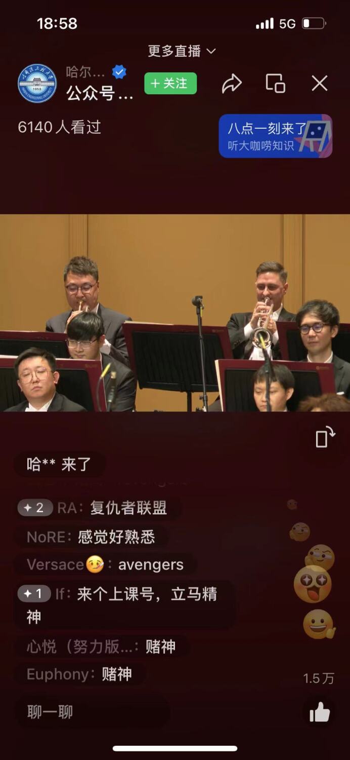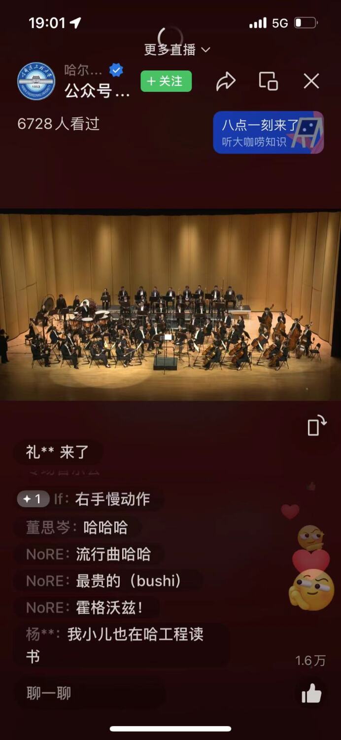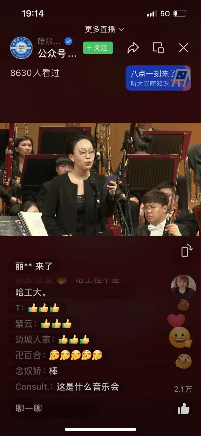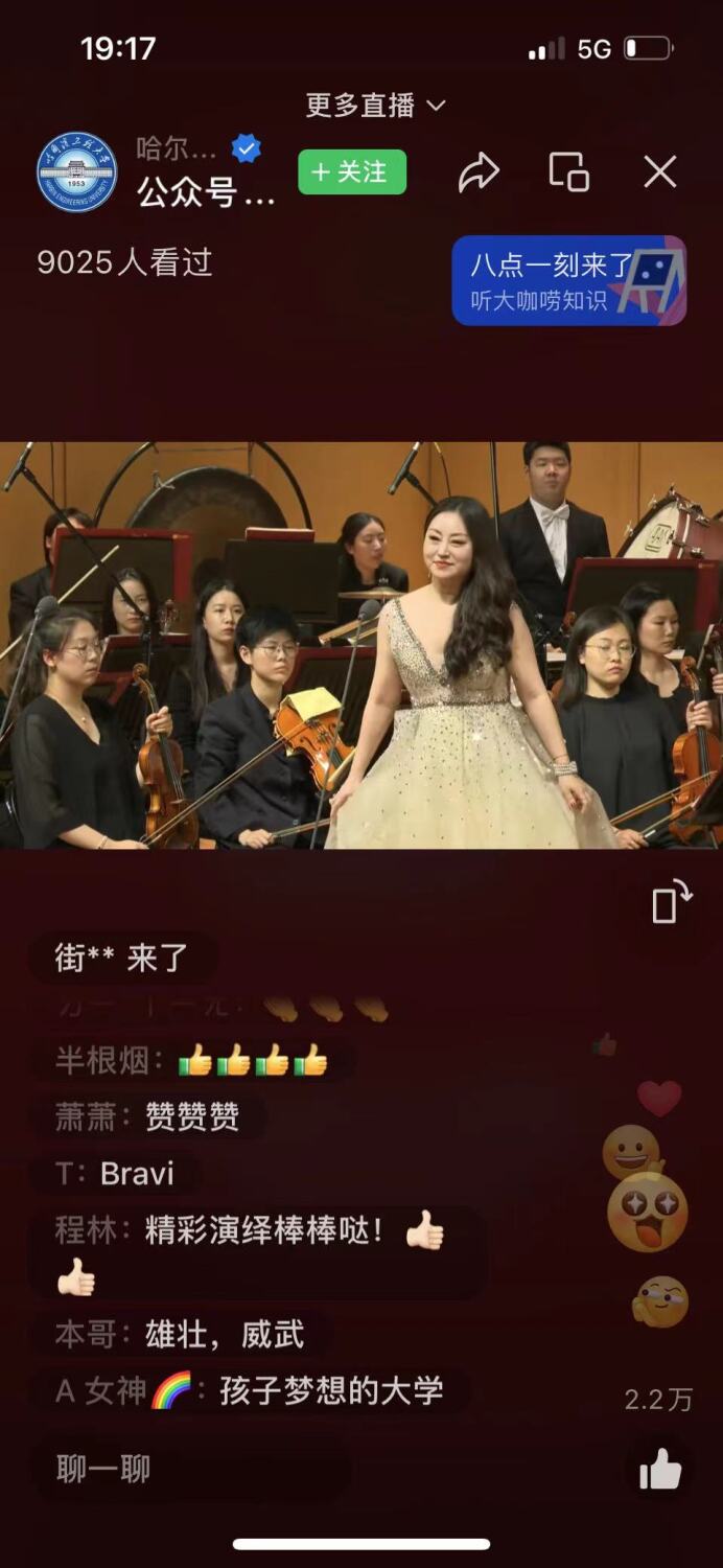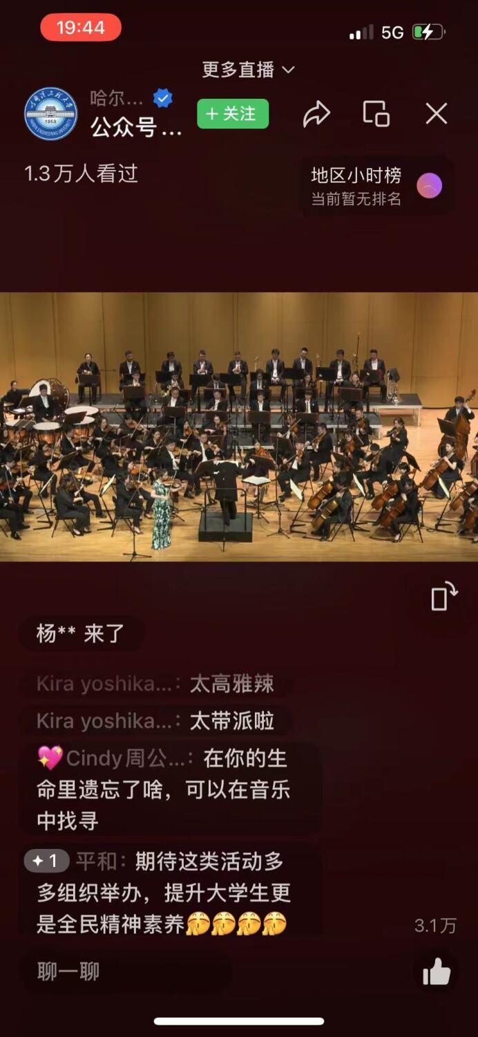 此场音乐会由哈尔滨工程大学现场直播,惠及观众上万人,好评如潮。听众们掩盖不住内心的兴奋,纷纷留言“扎实抓好主题教育,为奋进新征程凝心聚力”“初中的时候就有‘高雅艺术进校园’”“在你的生命里遗忘了啥,可以在音乐中找寻”“期待这类活动多多组织举办,提升大学生更是全民精神素养”“高雅艺术享受棒极了,为艺术家们的精彩演绎喝彩点赞,完美演绎!”“中国音乐大气,优雅,气势磅礴、振奋人心”。