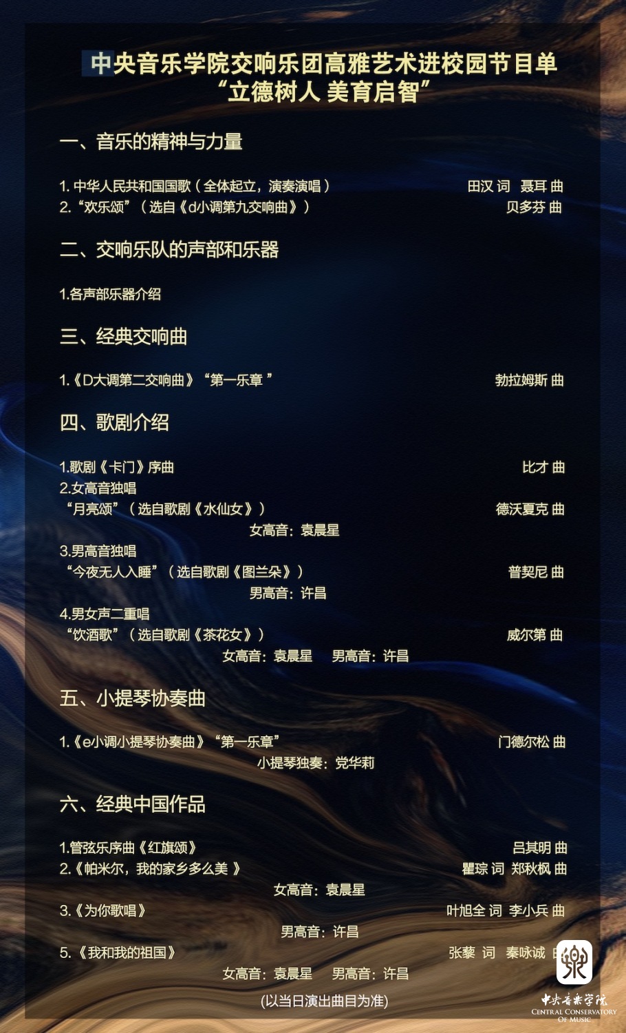 此次活动由著名指挥家,中国文联党组成员、副主席、书记处书记,全国政协委员,kaiyun体育网页登录入口校长俞峰教授担任艺术总监。通过对巡演曲目精心编排和创新,以不同时期、不同类型的音乐作品,让更多师生近距离接触经典中外音乐文化,满足广大人民对精神生活的更高追求,凝聚大众的爱国意识与民族自豪感!