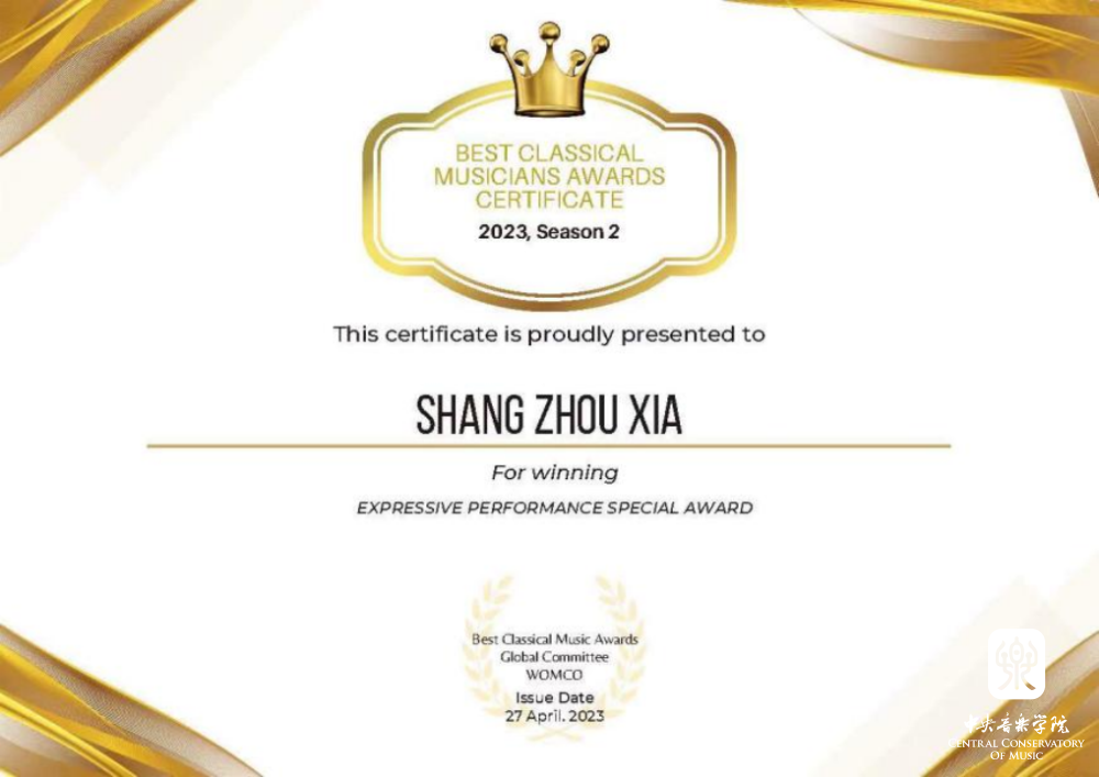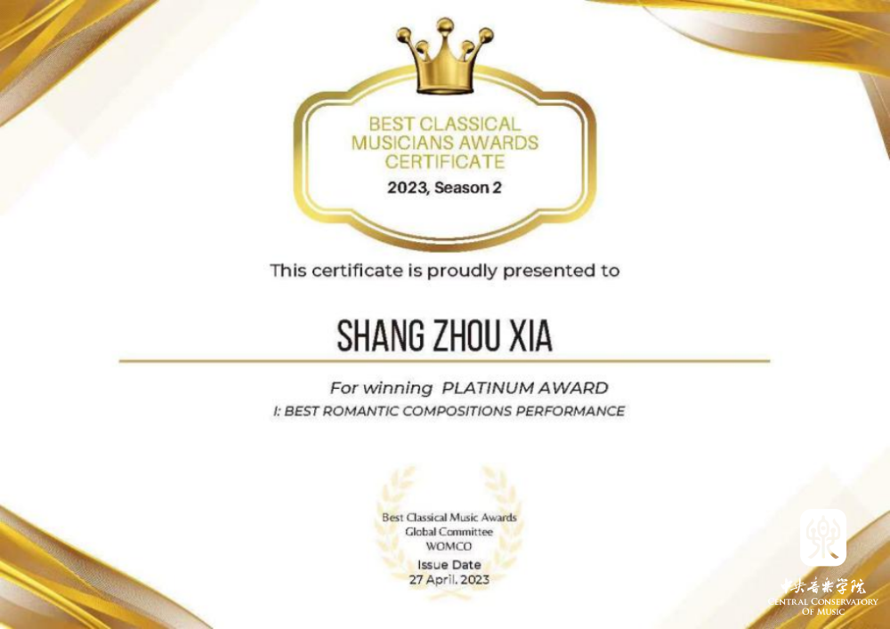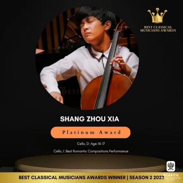 kaiyun官网附中大提琴表演专业学生夏商周在刚刚结束的2023英国最佳古典音乐家大赛(Best Classical Musicians Awards 2023)中获得三个奖项:(14-17岁组)白金奖、表现力表演特别奖、最佳浪漫作品表演奖;同时在英国举办的2023伟大作曲家比赛(GREAT COMPOSERS COMPETITION)中获得最佳柴可夫斯基演奏比赛(IV组)一等奖。这是他相继获得2023古斯塔夫·马勒奖大提琴比赛中获青少年组(VI组)冠军、在2023第四届维也纳国际音乐比赛中获青少年组银奖以及在2023伦敦古典音乐比赛 (LCMC) 获大提琴青少年组二等奖之后又获得的一系列奖项,指导教师娜木拉教授。
