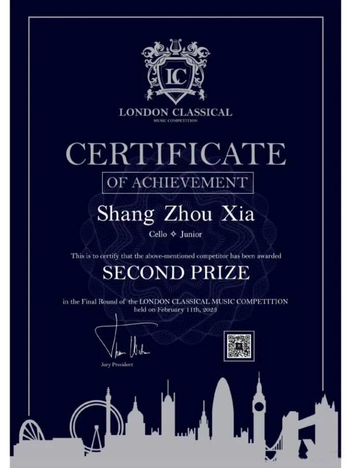 2023伦敦古典音乐比赛 (LCMC) 大提琴青少年组二等奖;
