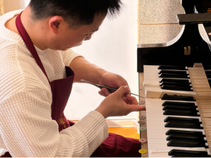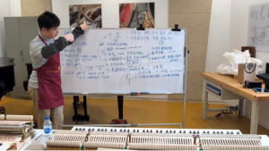本次培训的主要内容为三角钢琴击弦机系统调整与止音器系统调整。击弦机作为一台钢琴的“心脏”,对于钢琴的触感和音色都有着巨大的影响,而高标准的整调,也是让一台钢琴达到最佳状态不可或缺的工作。在老师的引导下,同学们首先对钢琴进行了试奏。老师说道:“每一位优秀技师都应当有对钢琴敏锐且细致的感受力,如果你们想成为顶尖的技师,在接触到一台琴时首先要花时间去演奏和感受它,然后再判断与确定需要进行的工作。在接下来的两周里,我们每做完一道工序都需要试奏,希望你们能够更深刻地感受并理解钢琴技师的工作是如何一点点让钢琴的演奏感觉产生变化的。”