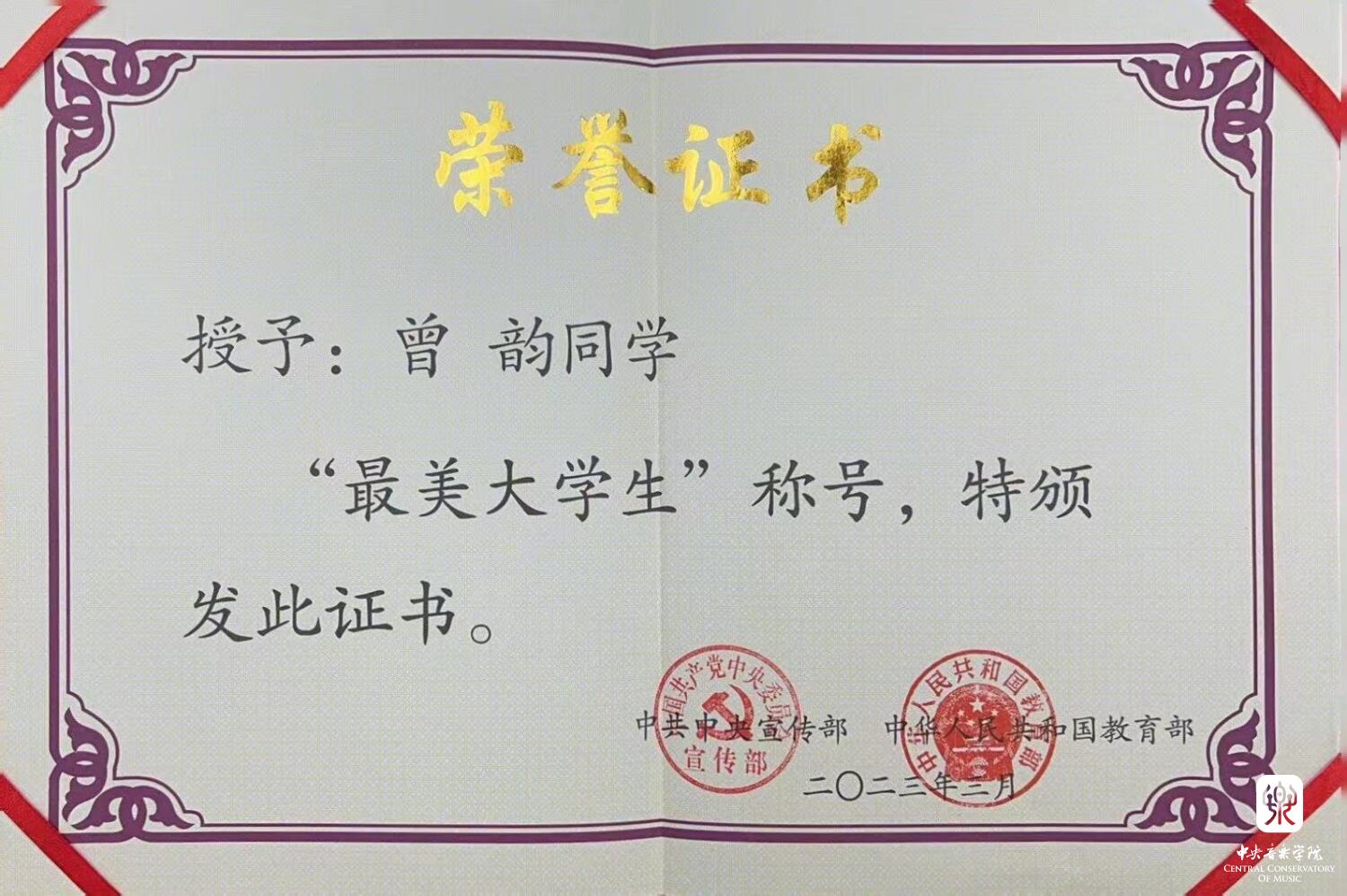 近日,中共中央宣传部、教育部在全国3000多万名在校大学生中评选出10名2022年“最美大学生”,kaiyun官网管弦系2021级硕士研究生曾韵同学获此殊荣。
