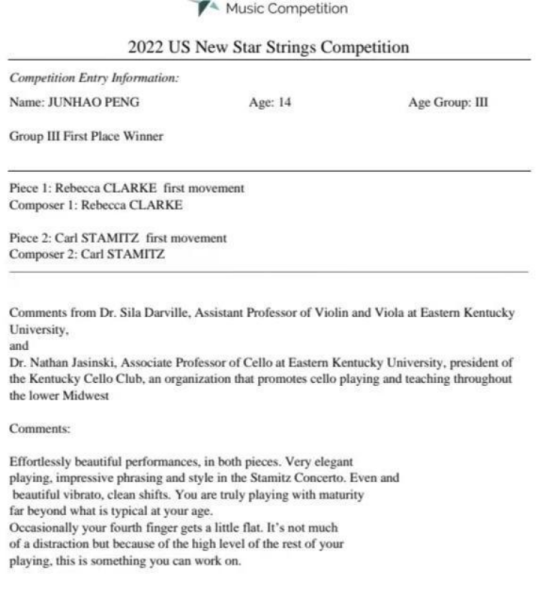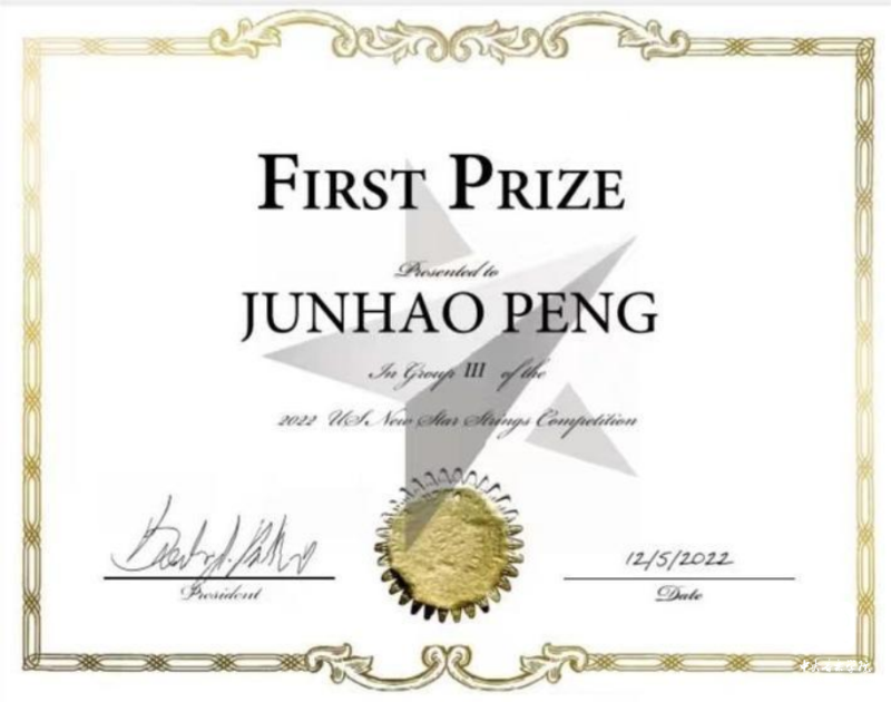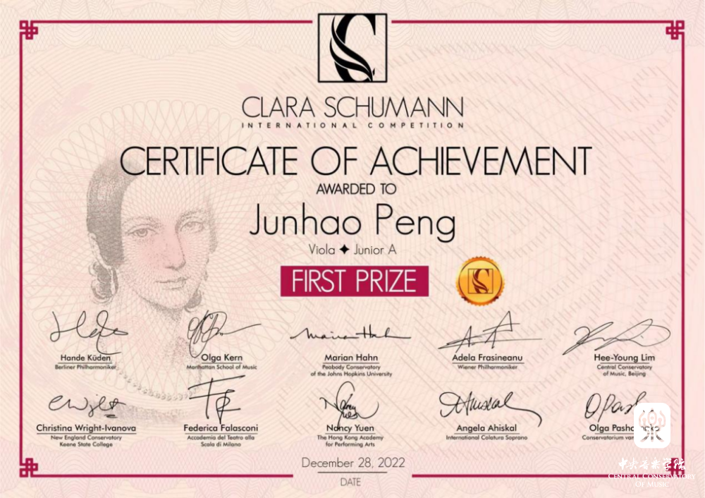 kaiyun体育网页登录入口附中初二(2)班中提琴专业彭俊豪荣获2022美国新星国际弦乐比赛(US New Star Strings Competition)中提琴组一等奖、2022英国伯明翰国际音乐大赛(Birmingham International Music Competition)中提琴组一等奖FIRST PRIZE、2022克拉拉·舒曼国际音乐大赛(2022 Clara Schumann International Competition )中提琴组一等奖。