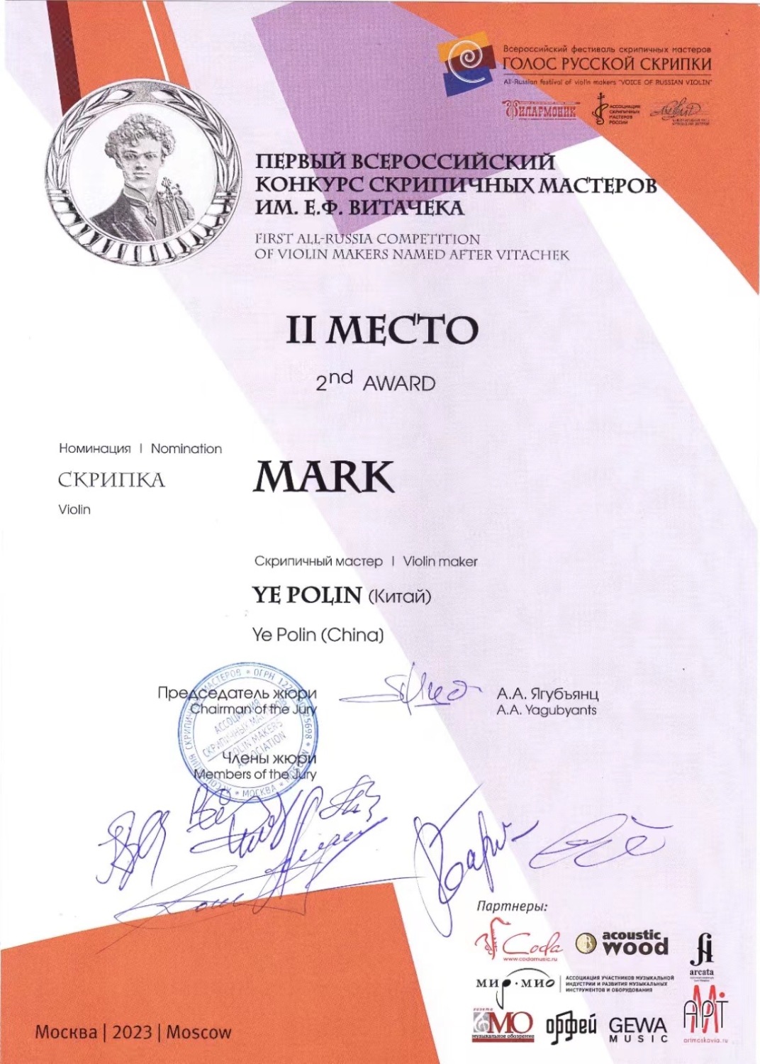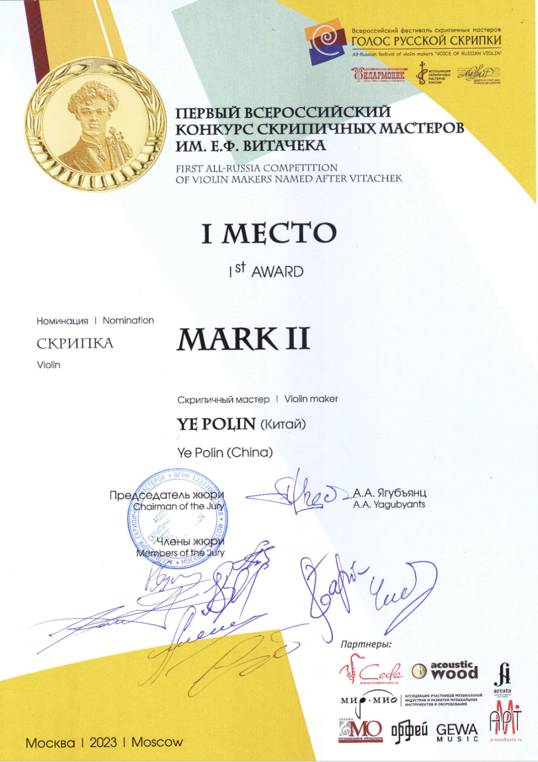 以E. F. Vitachek命名的全俄小提琴制作比赛,于2023年2月22日至25日在莫斯科举行,参赛选手不受年龄和国籍限制。经过三轮角逐,叶珀麟同学脱颖而出获得头奖,参赛的两把小提琴均为该同学就读本科期间着手制作,并于毕业后继续完成的作品。