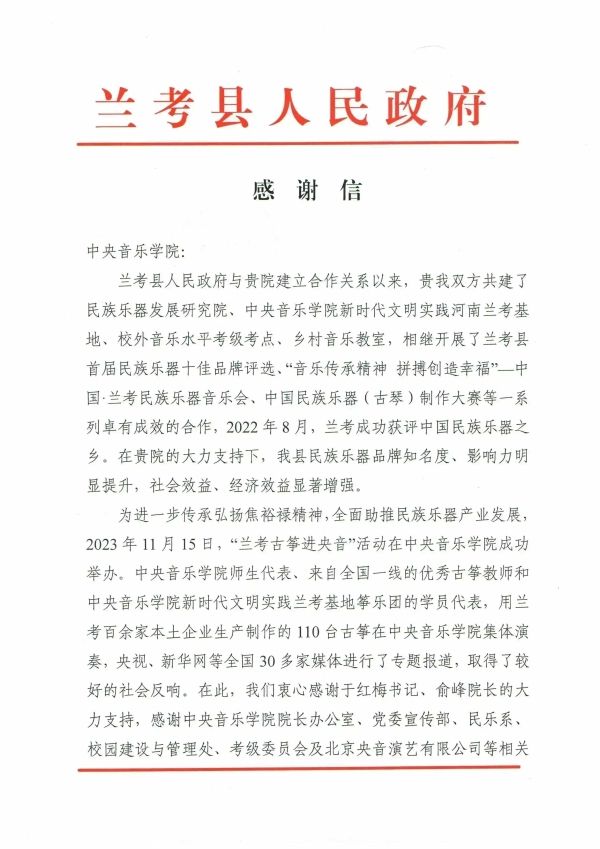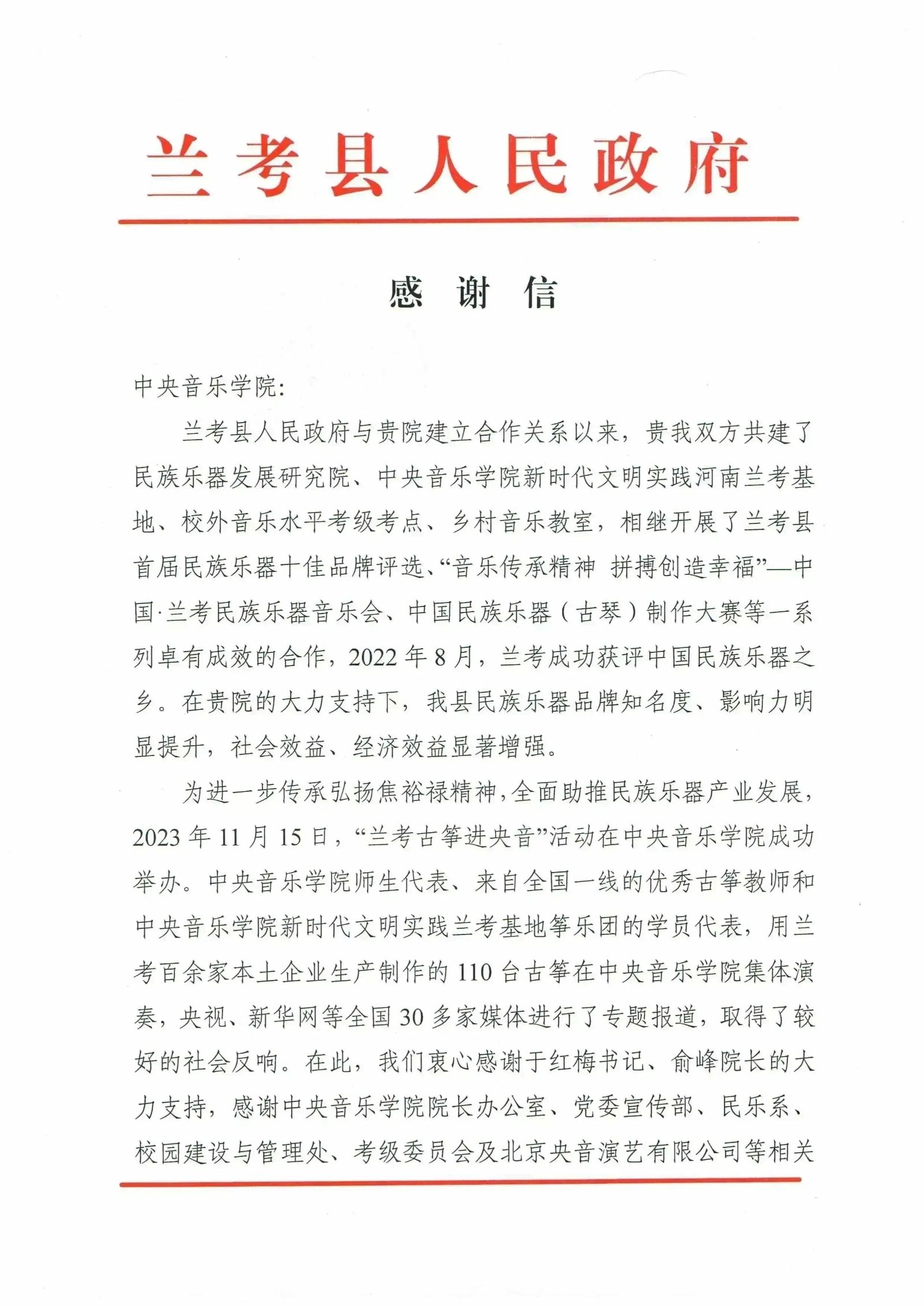 近日,兰考县人民政府向kaiyun官网致信,对学校的大力支持表示感谢。自兰考县人民政府与kaiyun体育网页登录入口建立合作关系以来,学校积极发挥专业人才资源优势,成立新时代文明实践河南兰考基地,派驻文艺宣讲师常驻当地,设立兰考央音校外音乐水平考级考点,与兰考县人民政府共同设立民族乐器发展研究院,举办“兰考古筝进央音”等活动等,推进了兰考县美育工作的做深做实,助推了兰考民族乐器产业的蓬勃发展,生动践行了“艺术服务人民”的宗旨,弘扬了焦裕禄精神。