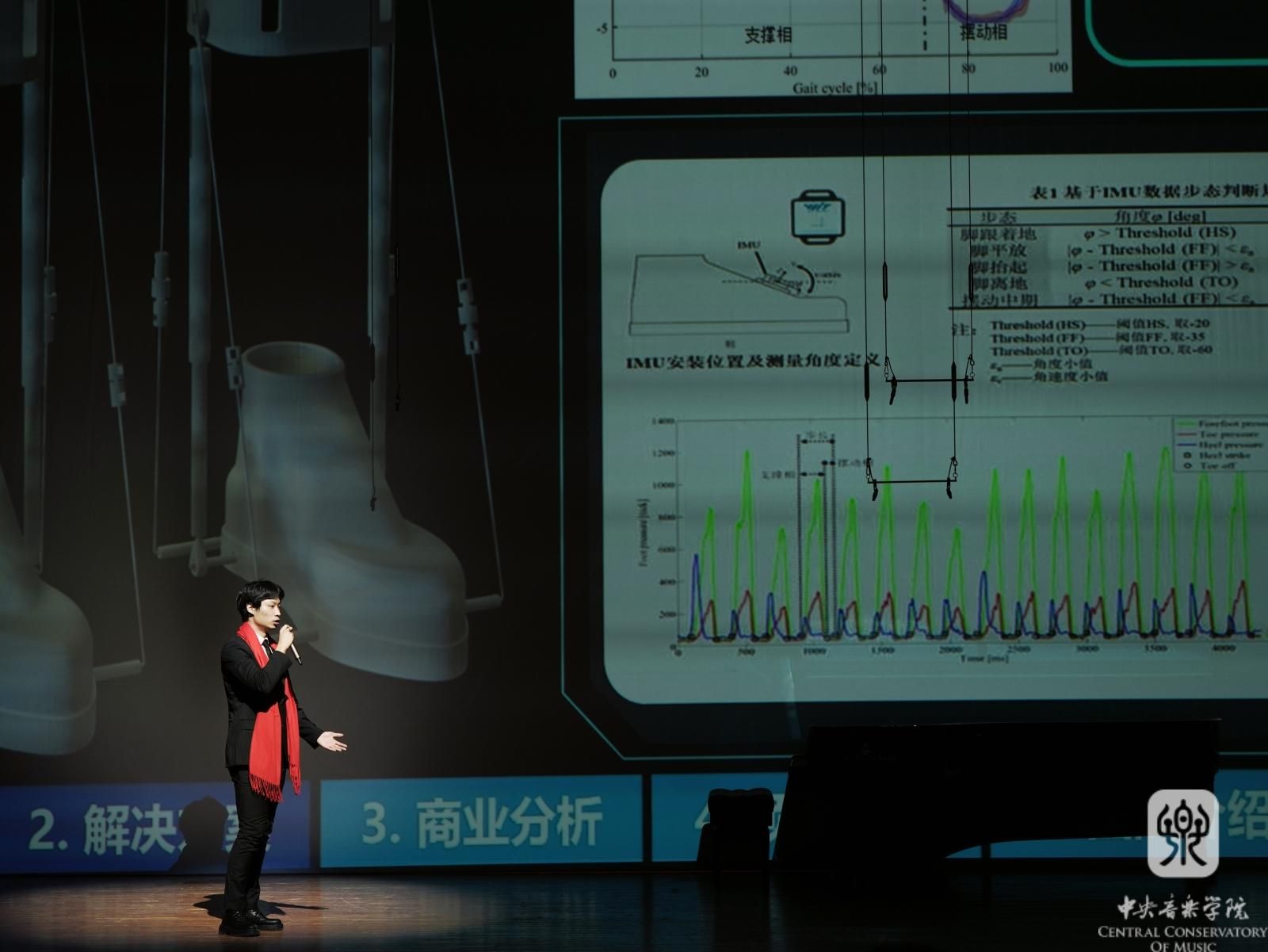 音乐人工智能与音乐信息科技系博士生王天乐在新年音乐会上介绍参赛项目“Bixo——世界首创的双向线驱动下肢康复外骨骼机器人”,项目着眼当下外骨骼笨重、附加转动惯量大、昂贵等痛点,攻关提出世界首创的8 字仿生关节、AI 步态学习等创新技术,已开展临床试验,帮助患者恢复行走。