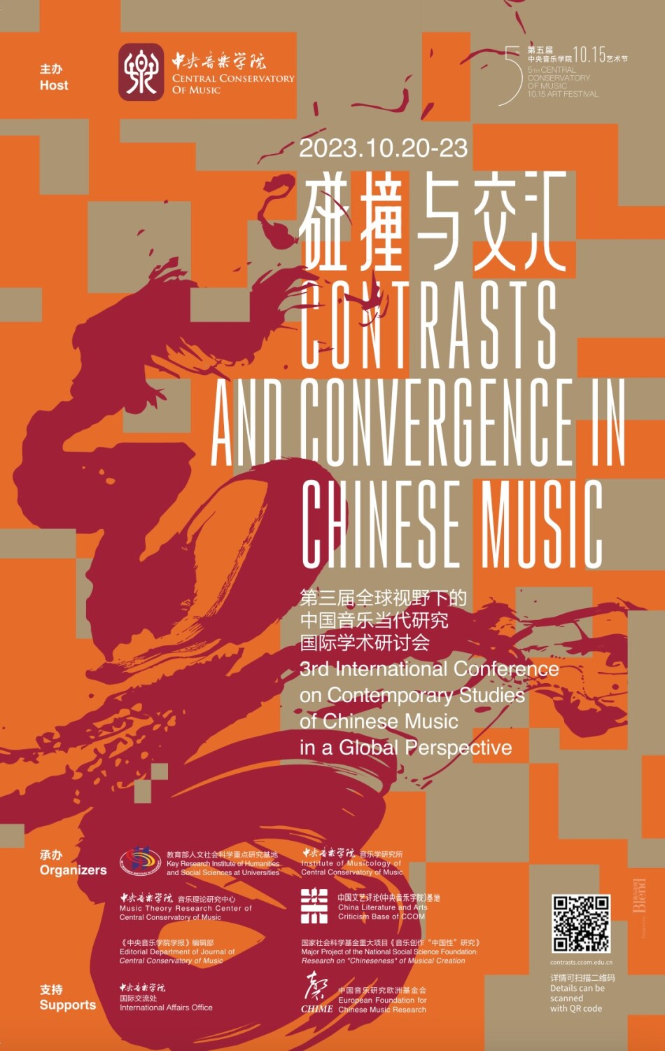 The Third International Conference on "Contrast and Convergence: Contemporary Chinese Music Research in a Global Perspective", hosted by the Central Conservatory of Music, undertaken by the Institute of Musicology of the Central Conservatory of Music, a key research base of humanities and social sciences of the Ministry of Education, and the China Literature and Art Review (Central Conservatory of Music) Base, co-organized by the European Foundation for Chinese Music Research and its CHIME journal, the Center for World Music of the University of Hildesheim / the University of Music, Drama and Media Hannover, and the editorial department of the Journal of the Central Conservatory of Music, will be held at the Central Conservatory of Music from October 20th to 23rd, 2023.
