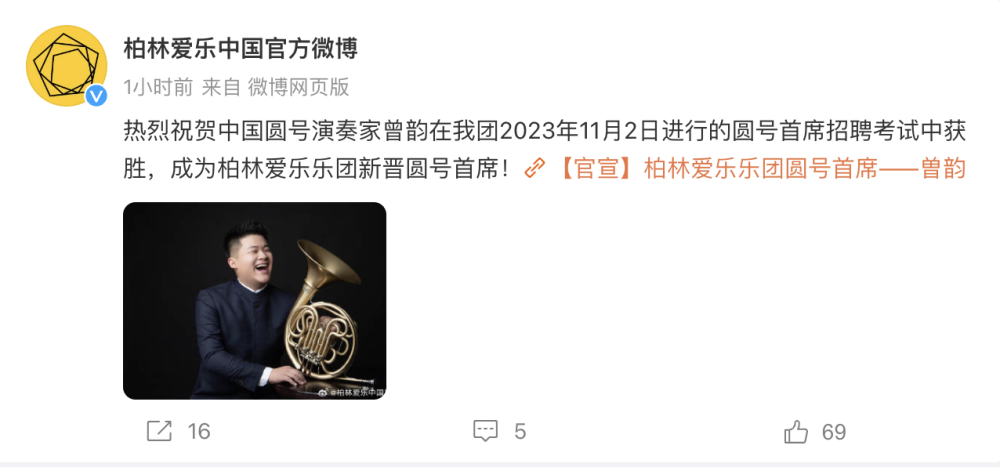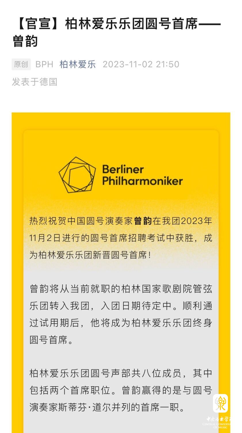 曾韵你好!柏林爱乐官宣刚宣布你成为新晋圆号首席,这一重大喜讯顿时让kaiyun体育网页登录入口师生们沸腾了,音乐界沸腾了!