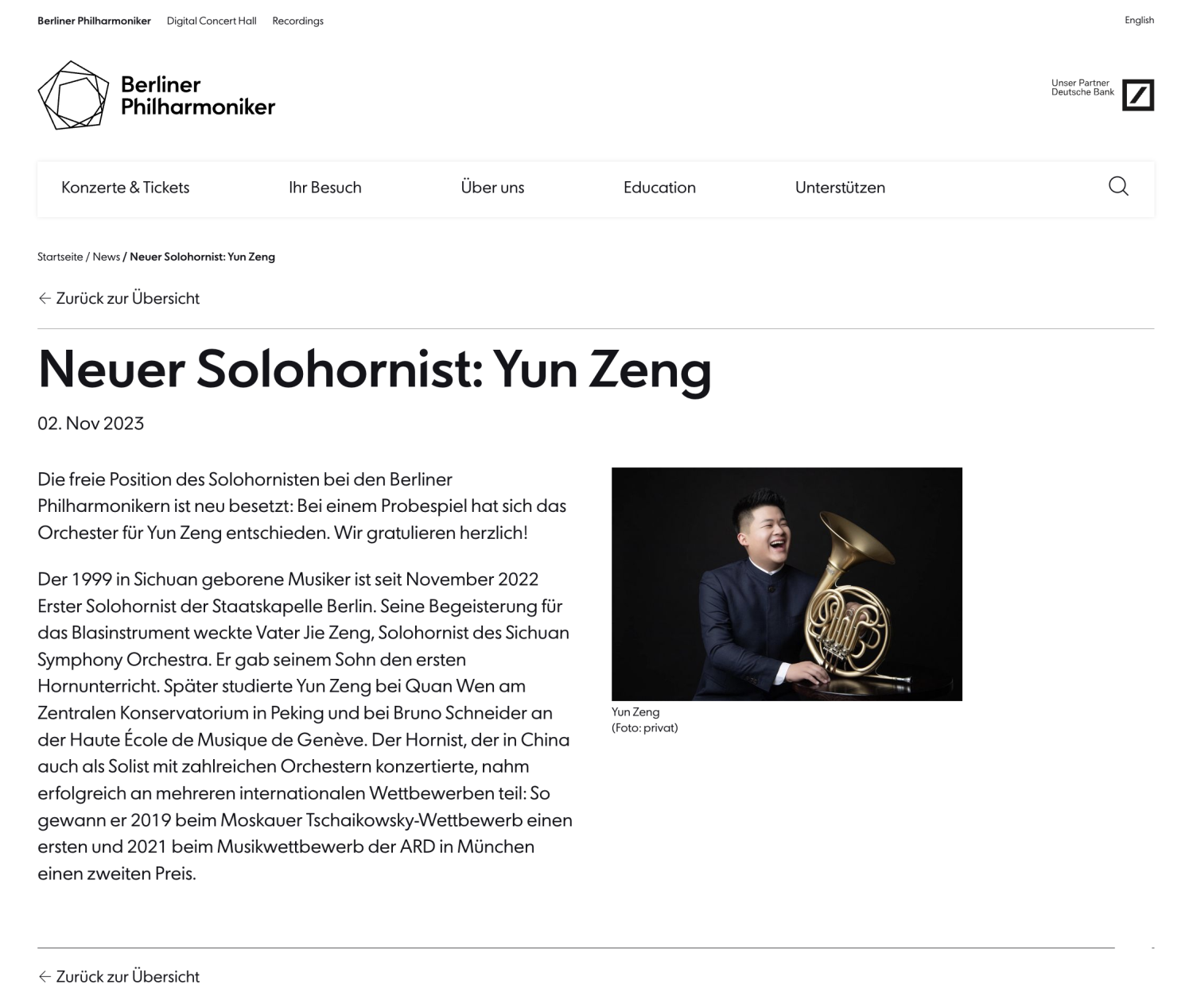 柏林爱乐乐团官网发布消息,热烈祝贺曾韵担任圆号首席(https://www.berliner-philharmoniker.de/news/detail/neuer-solohornist-yun-zeng/)