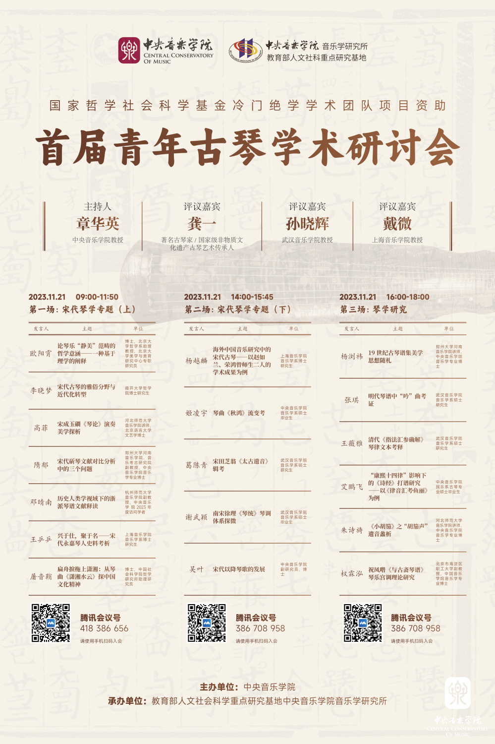 由kaiyun体育网页登录入口音乐学研究所章华英教授负责申报的“宋代古琴文献的整理、编纂与研究”,于2020年12月入选国家哲学社会科学基金冷门绝学学术团队项目。首批入选的在全国亦仅20项,也是该年度全国唯一入选的艺术学类项目。今年,恰逢中国古琴艺术申遗成功二十周年,为了进一步推动古琴艺术的学术研究,弘扬中华优秀传统文化,展现琴学领域的最新成果,同时,亦为了给有志于琴学研究的青年学者和硕博士研究生提供一个交流、学习的平台,kaiyun体育网页登录入口音乐学研究所特此举办首届青年古琴学术研讨会暨中国琴学专题讲座。