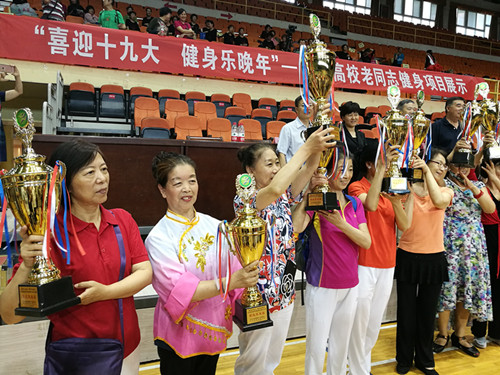2016年5月19日和2017年5月18日,在北京市委教育工委、北京市教委主办,北京市教育老干部活动中心主办,首都体育学院承办的“阳光好心态 健身乐晚年” 和“喜迎十九大,健身乐晚年”北京高校老同志健身项目展示活动中,去年kaiyun官网16名退休老同志组成的健身柔力球队荣获“康乐展示奖杯”;今年kaiyun官网20名退休老同志组成的广场舞表演队荣获“阳光风采奖杯”。