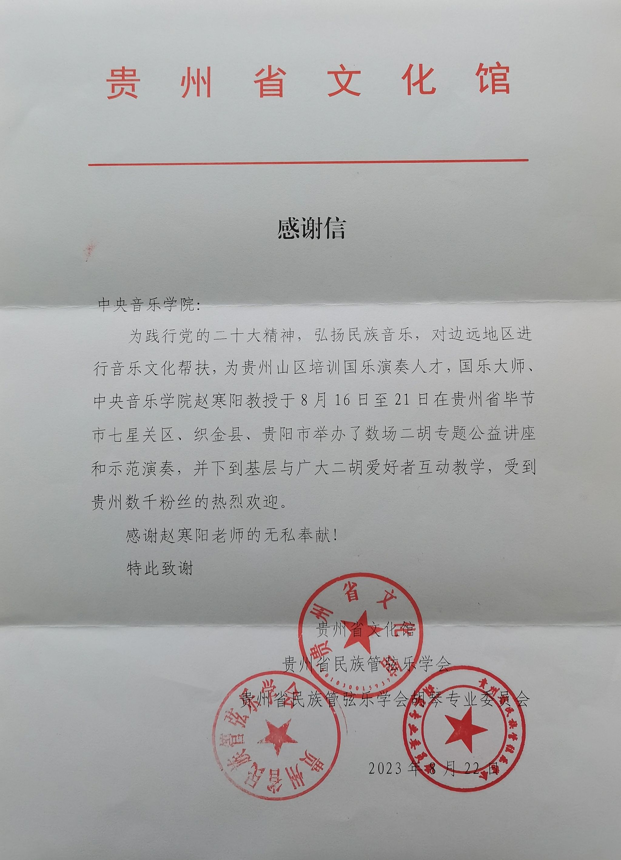 (下图是贵州民族管弦学会对赵寒阳教授在贵阳市举办的数场公益讲座和示范讲座发来的感谢信)