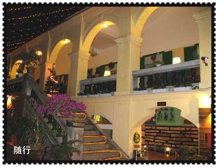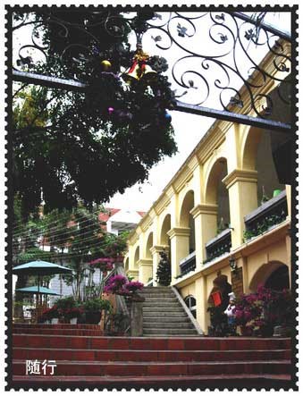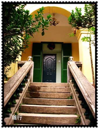这是一栋英式建筑,回字形。在回字中心的“口”字的位置,隔成两遛房间,两侧房间的内墙是共同的,房门则朝不同的方向,共约有十个房间。回字是小“口”外套一个大“口”,这大口的外框是一圈柱子,连接柱子之间的是一米多高,用水泥砌成的透空的低矮围拦,这围拦宽约30公分,可以摆放盆花、盆景。这大、小两个口的中间就是一圈宽有5、6米的温馨、迷人又舒适的回廊。这房子建在花园一般的院子中间。没有院墙只有拦杆。视线可穿过拦杆极目远望。海风可自由穿梭,鸟语花香任凭享受。