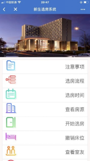暑假期间,新生按照通知书中的选房说明,在家就可以登录学校企业微信号中进行选房操作。选房以同年级同系为原则,让学生自由选择床位,不仅提高了工作效率,学生还选到了心仪的宿舍,与好朋友住到一起,有利于减少宿舍矛盾,同学们和谐相处,让新生选房实现“自由行”。