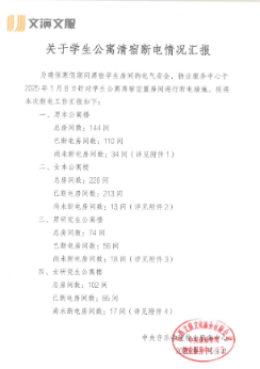 《寒假期间公寓断电工作》截止2025年1月9日断电464间,确保了公寓用电安全。