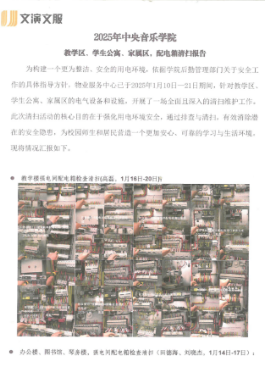 2025年1年10日至21日完成了《教学区、学生公寓、家属区的配电箱进行清扫紧固》工作,确保假期配电设备设施安全运行。