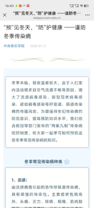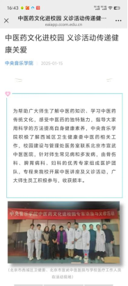 寒假期间,医务室围绕“弘扬传统文化”与“冬季健康防护”两大主题,在学校官微发布了《中医药文化进校园 义诊活动传递健康关爱》、《“预”见冬天,“防”护健康——谨防冬季传染病》两篇宣传稿。两篇稿件一“承”一“防”,既彰显学校在文化育人中的传承与创新,又凸显对师生身心健康的细致关怀。在为师生健康服务的道路上,我们一直在努力!