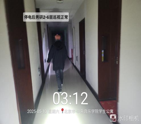 停电后工作:00:54分正式断电,停电后每2小时值班老师逐一楼层进行巡视,确保楼内无使用明火照明的情况。