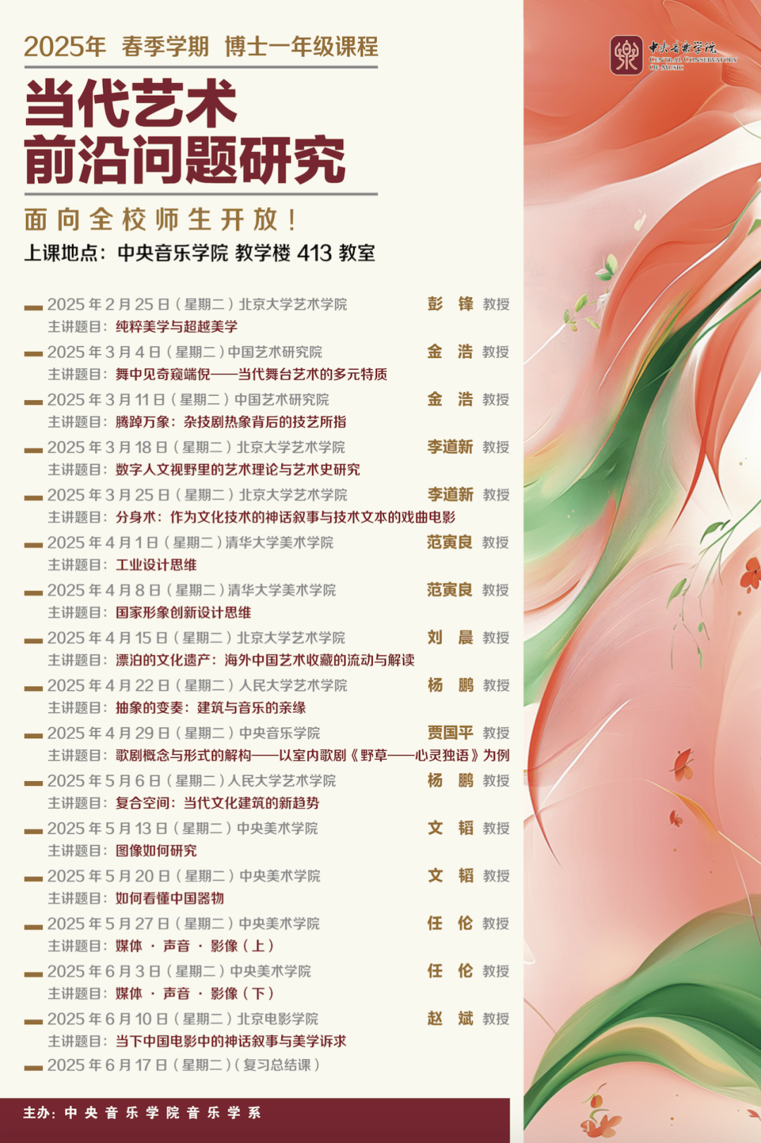 “当代艺术前沿问题研究”是为音乐学系一年级博士研究生开设的必修课。邀请艺术领域多位知名专家共同授课,内容涉及音乐、美术、电影、戏剧、设计、建筑、多媒体艺术等多个领域,以具体艺术个案于理论作为教学研讨核心。促进跨界交流,开阔学术视野,关注当代,启迪未来。