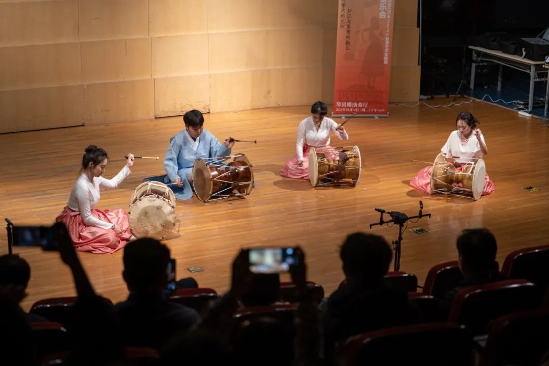 朱珠在演奏韩国传统音乐《挥莫里长短》前,为大家介绍朝鲜族的传统乐器长鼓,以及作品中出现的“长短”节奏模式和衬词的作用,她们的演奏不仅渲染了作品热闹的氛围,也带大家了解到朝鲜族音乐的独特魅力。